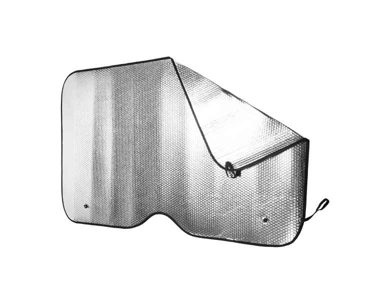 Автомобильная солнцезащитная шторка с двух сторон из пузырчатого алюминия и окантовкой. В комплект входят присоски и черные эластичные ремни для складывания.