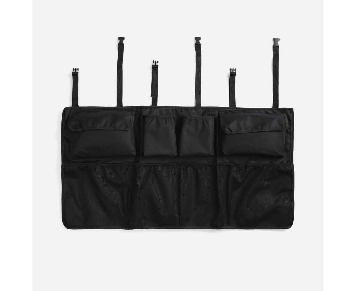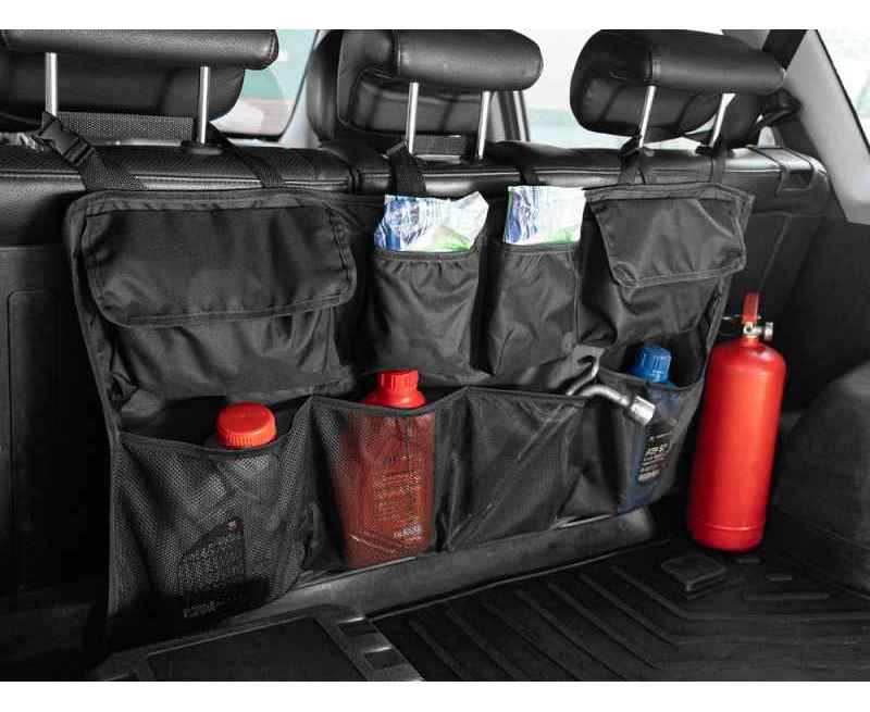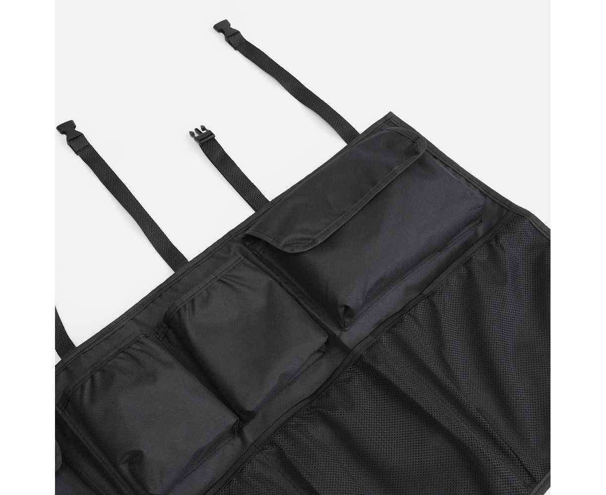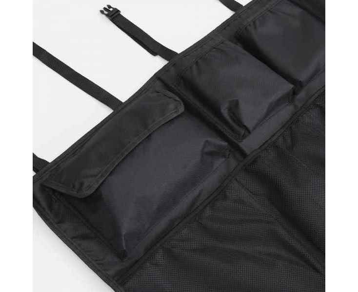 В органайзере имеются разные по форме и типу карманы: карманы-сетки, карманы с крышкой на липучке и открытые карманы. Конструкция крепится ремнями за подголовники задних сидений. Дополнительно на его задней части имеются ленты-липучки, которые обеспечивают полное прилегание к спинкам задних кресел.