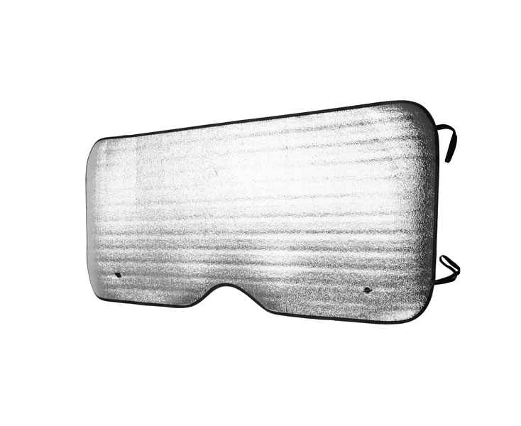 Прямоугольная солнцезащитная шторка для автомобиля с алюминиевой передней частью и белой задней частью из вспененного материала. Две металлические проушины в обоих верхних углах для присосок. Черная окантовка и эластичные ремни для складывания.