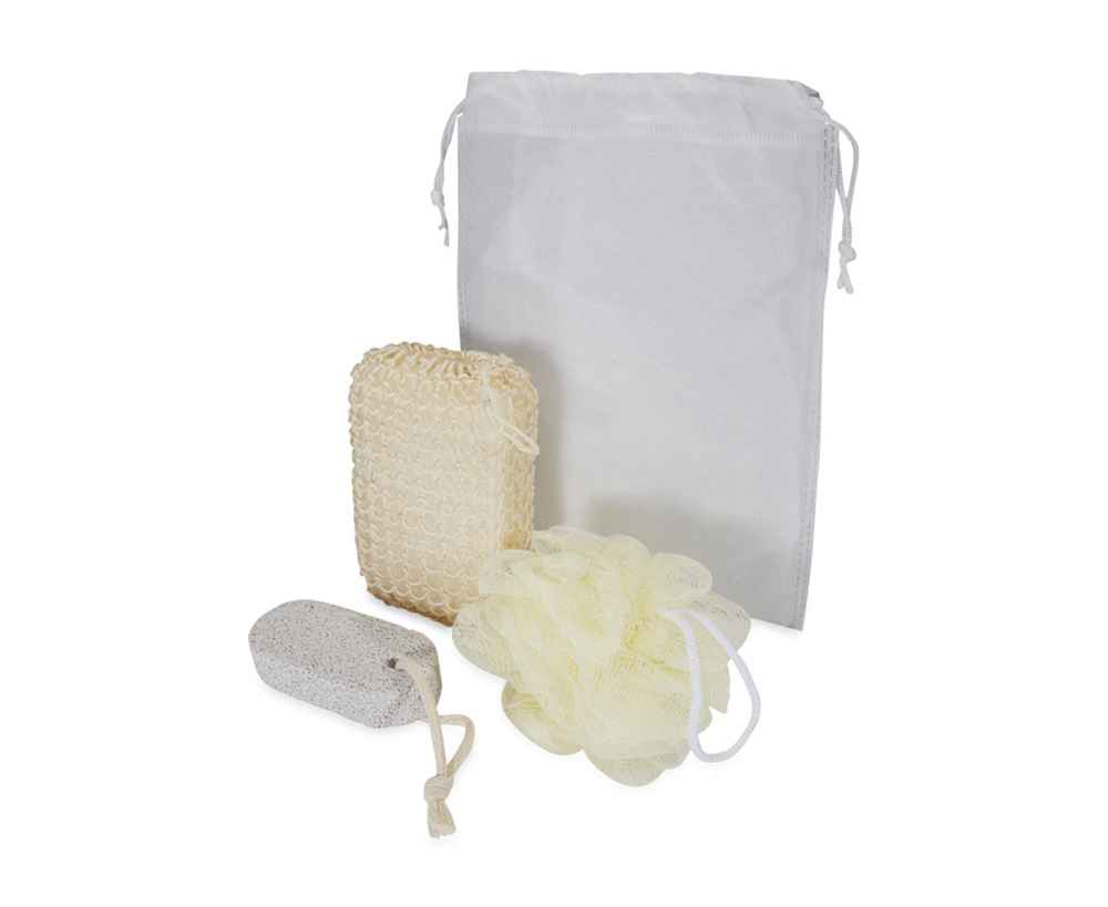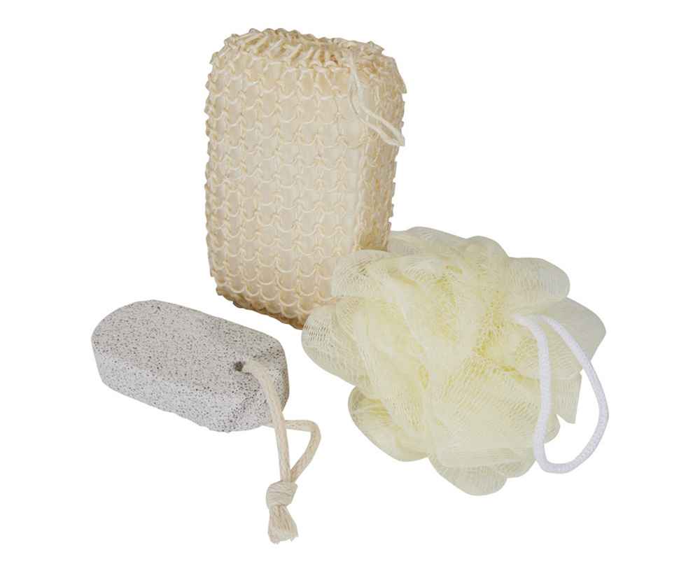 Набор из трёх банных аксессуаров для полноценного ухода за телом. В комплект входят мочалка-люфа для мягкого очищения кожи, пемза для ухода за стопами и губка из натурального мексиканского сизаля для лёгкого массажа и отшелушивания. Все принадлежности удобно хранятся в практичном мешочке из полиэстера — компактно и стильно.