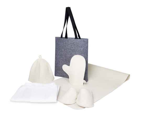 Банный набор Healing для настоящего ценителя сауны: коврик-лежак, мужской вафельный килт, рукавица, шапка, тапочки — всё в стильном фетровом шоппере.