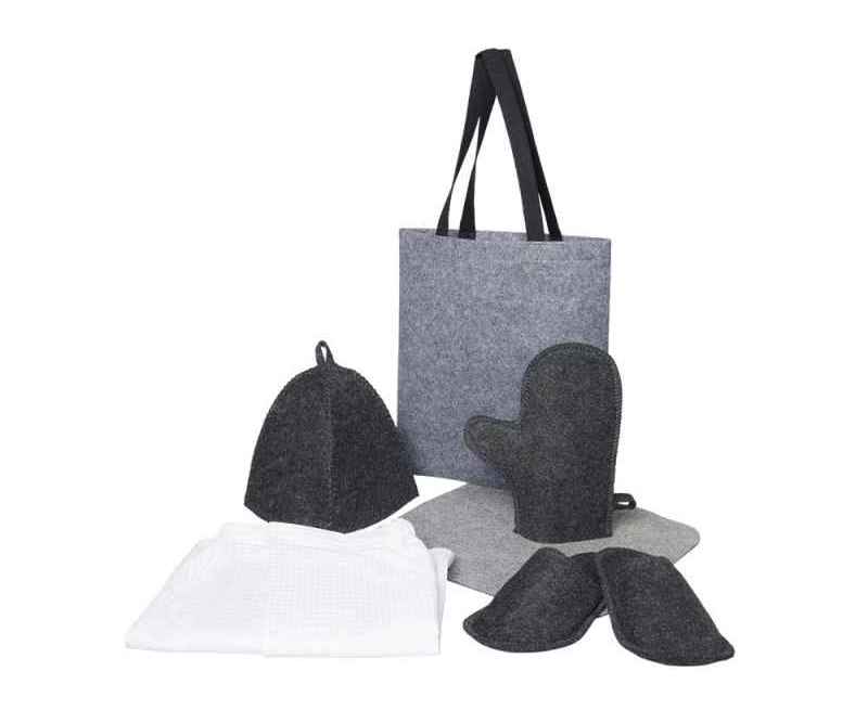 Банный набор Healing для настоящего ценителя сауны: коврик, мужской вафельный килт, рукавица, шапка, тапочки — всё в стильном фетровом шоппере.
