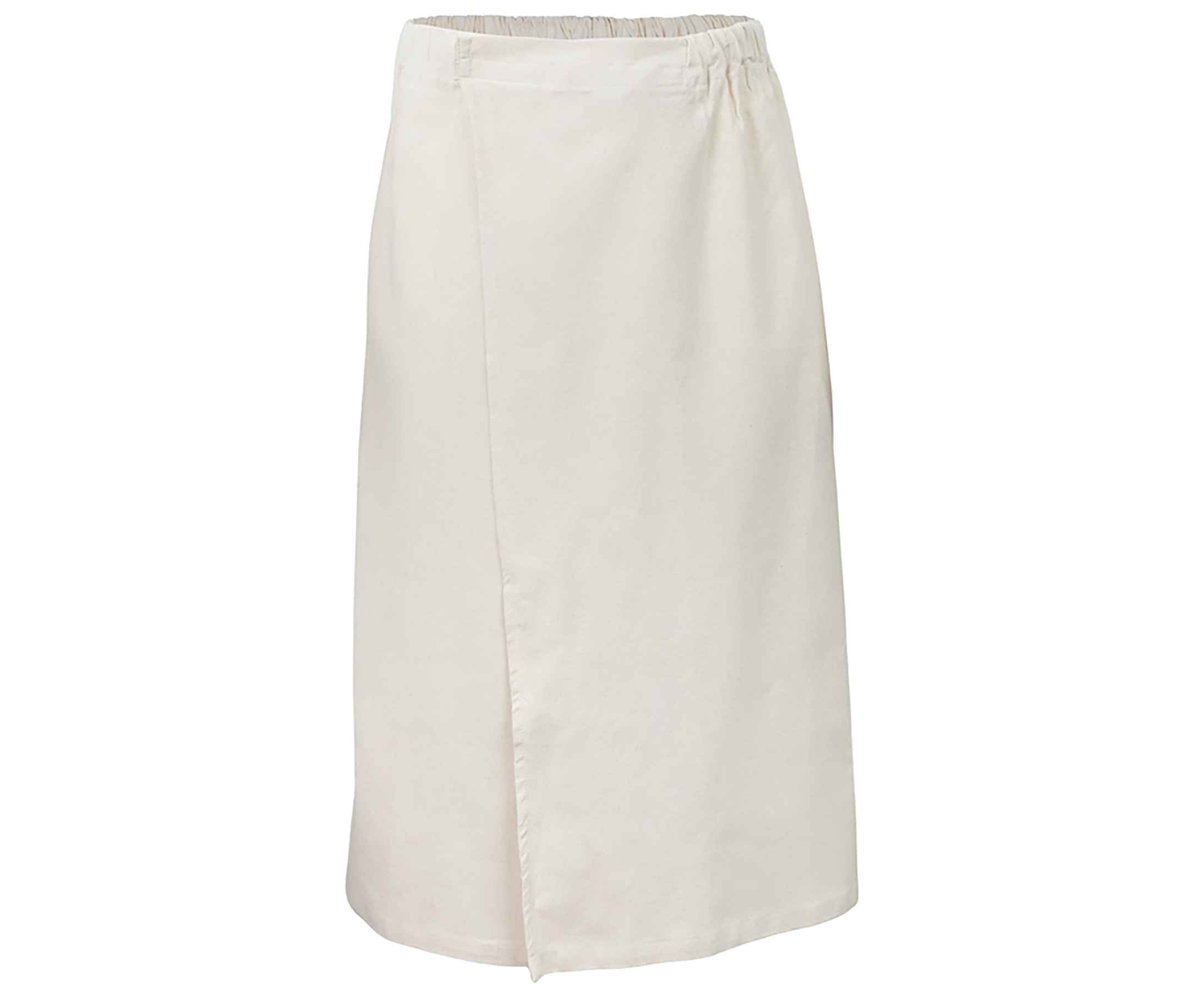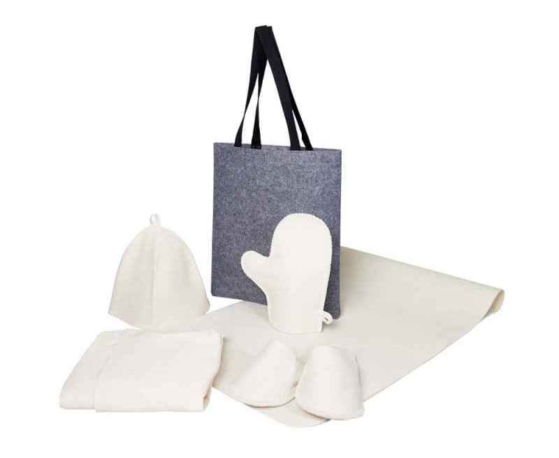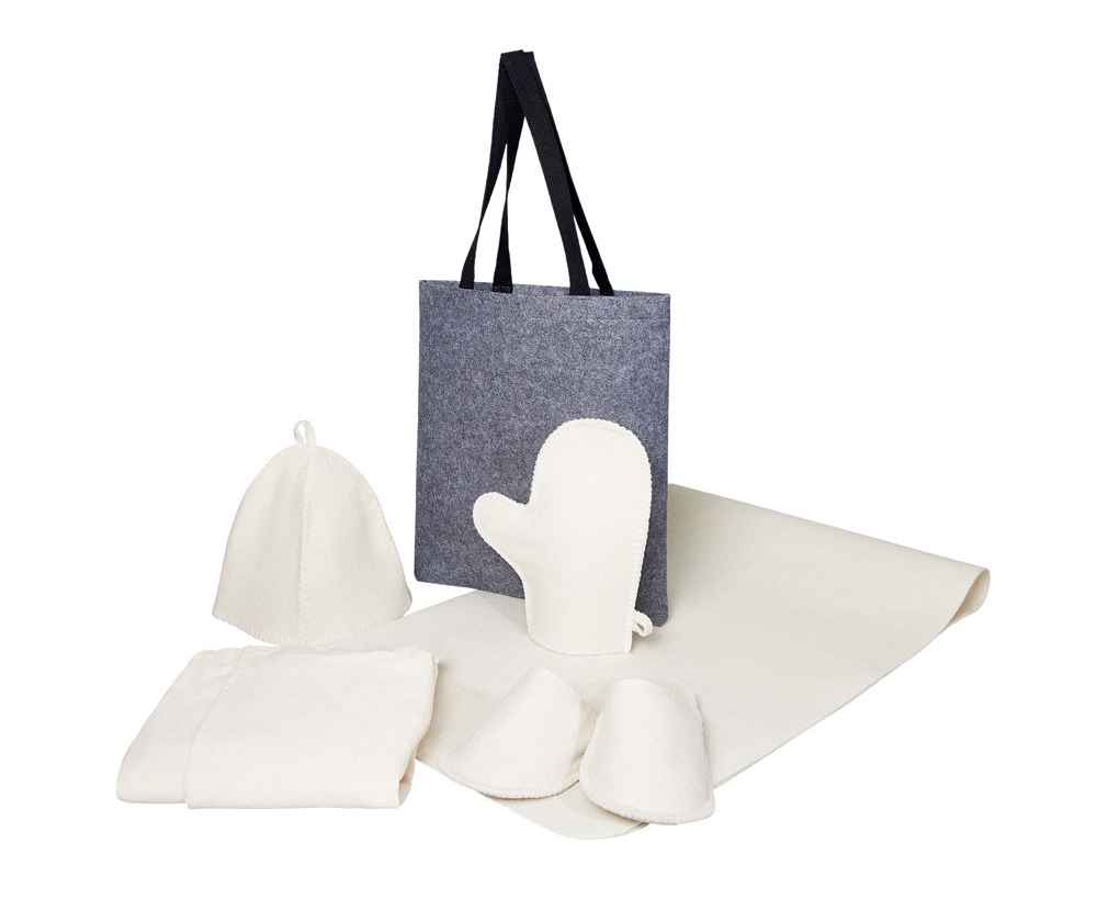 Женский банный набор Healing для комфортного отдыха: лежак для бани, холщовый килт-парео, рукавица, шапка и тапочки — всё аккуратно упаковано в стильный фетровый шоппер.