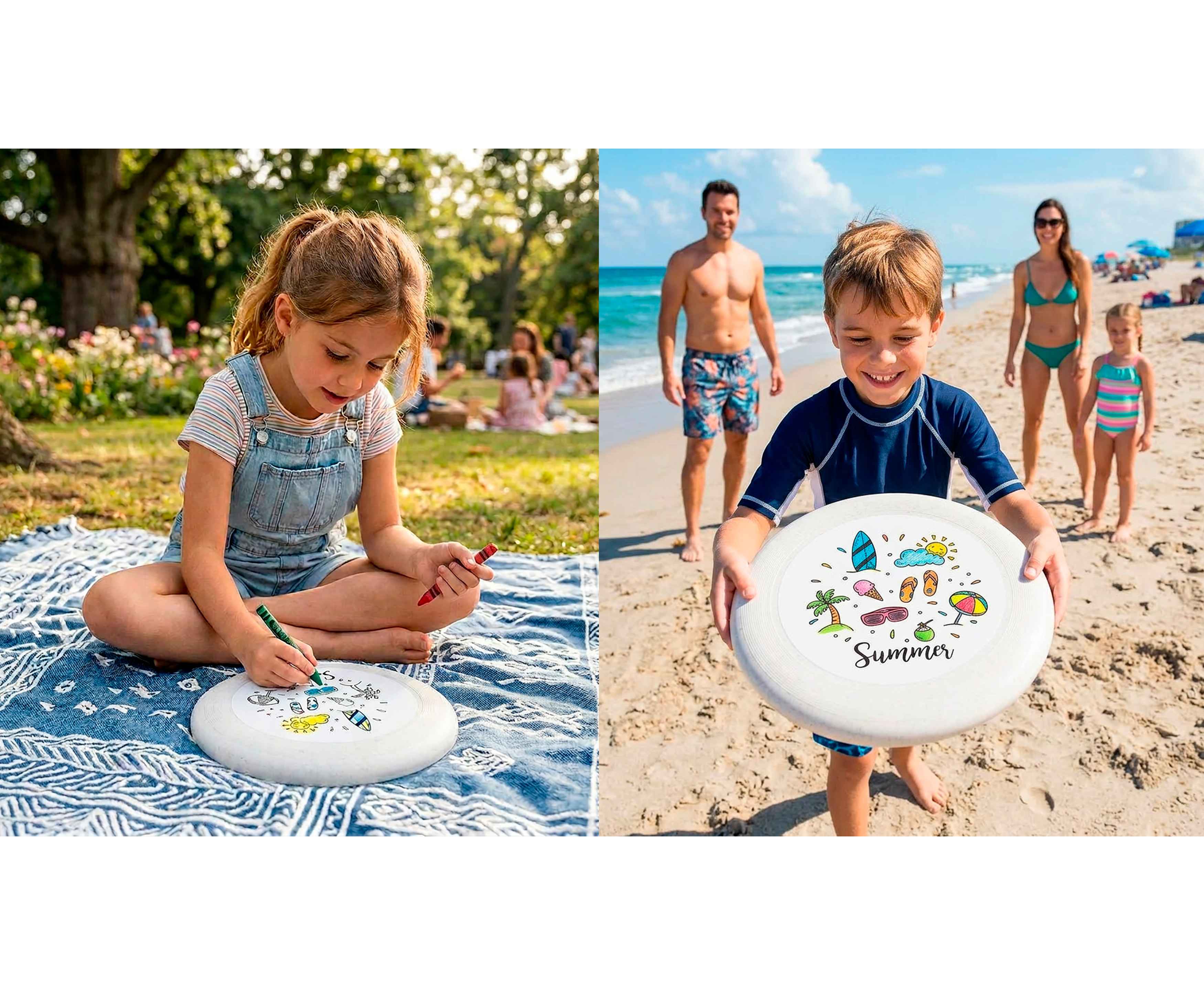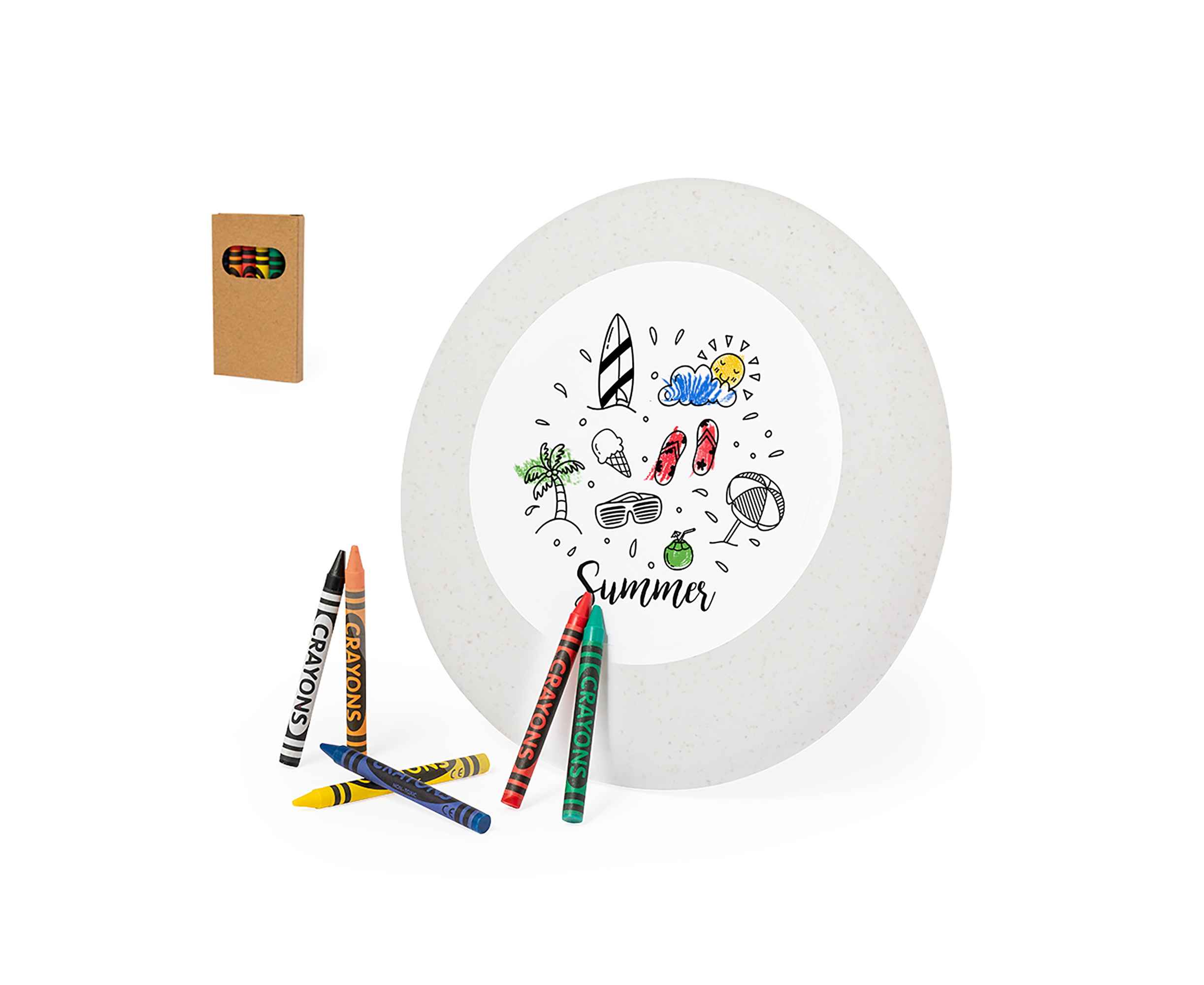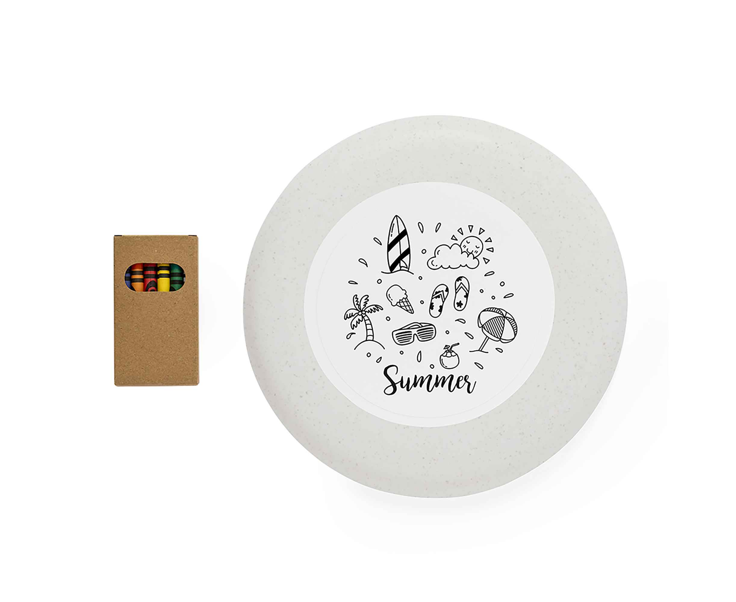 Лето – время ярких красок, веселья и активностей. Новинка – фрисби-раскраска для игр и творчества. 6 восковых карандашей в комплекте, яркие оттенки для создания авторской тарелки. Простая активная игра для 2 и более человек, идеальна для прогулок, пикников, дней рождения и отдыха на пляже. Восковые карандаши безопасны, не пачкают одежду, корпус тарелки изготовлен из пластика с добавлением растительных волокон.