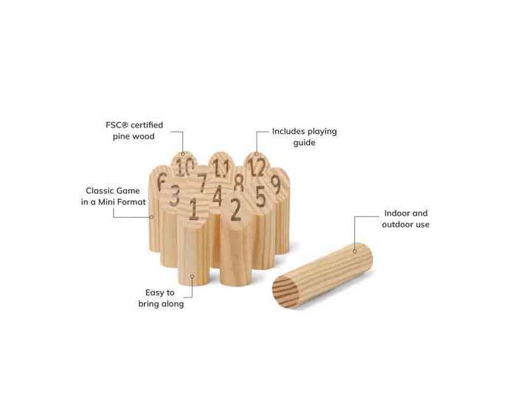 Мини-версия классической игры Финские кегли, которую легко взять с собой на отдых. Простой нестареющий дизайн, фигуры изготовлены из сертифицированной FSC® древесины сосны. Цель игры — первым набрать ровно 50 очков. Игра упакована в холщовую сумку с сетчатой задней стенкой, что делает ее удобной для переноски. Инструкция с правилами в комплекте.