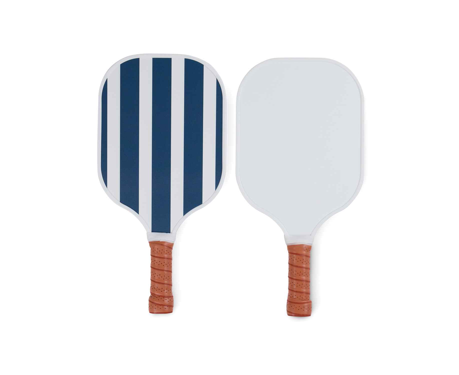Ракетки изготовлены из фанеры, сертифицированной FSC®, и имеют классический двухцветный полосатый дизайн с одной стороны и гладкое белое покрытие с другой. Ручка выполнена из удобного материала PU (полиуретан) для мягкого захвата и тактильного комфорта.