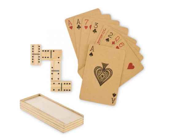 Набор игр, включающий в себя колоду карт из переработанной бумаги и деревянное домино. Представлен в коробке из МДФ.