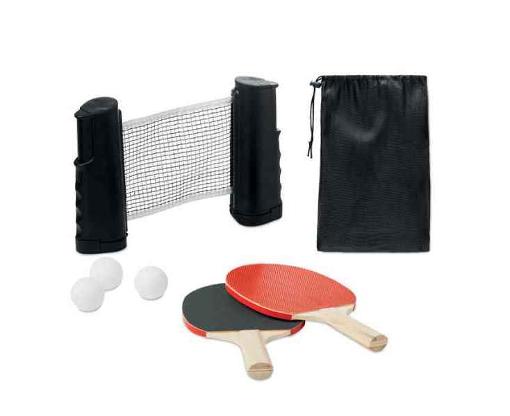 Набор для настольного тенниса с сеткой. Включает 3 мяча, 2 ракетки и 1 раздвижную сетку в чехле из RPET.