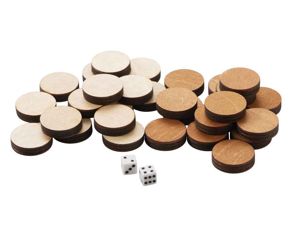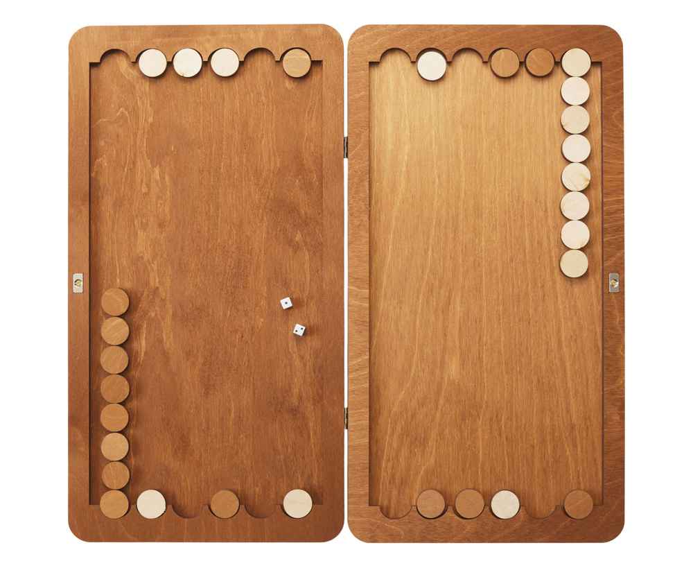 В комплект входят фишки из фанеры двух оттенков, гармонирующих с базовым цветом доски.