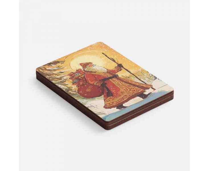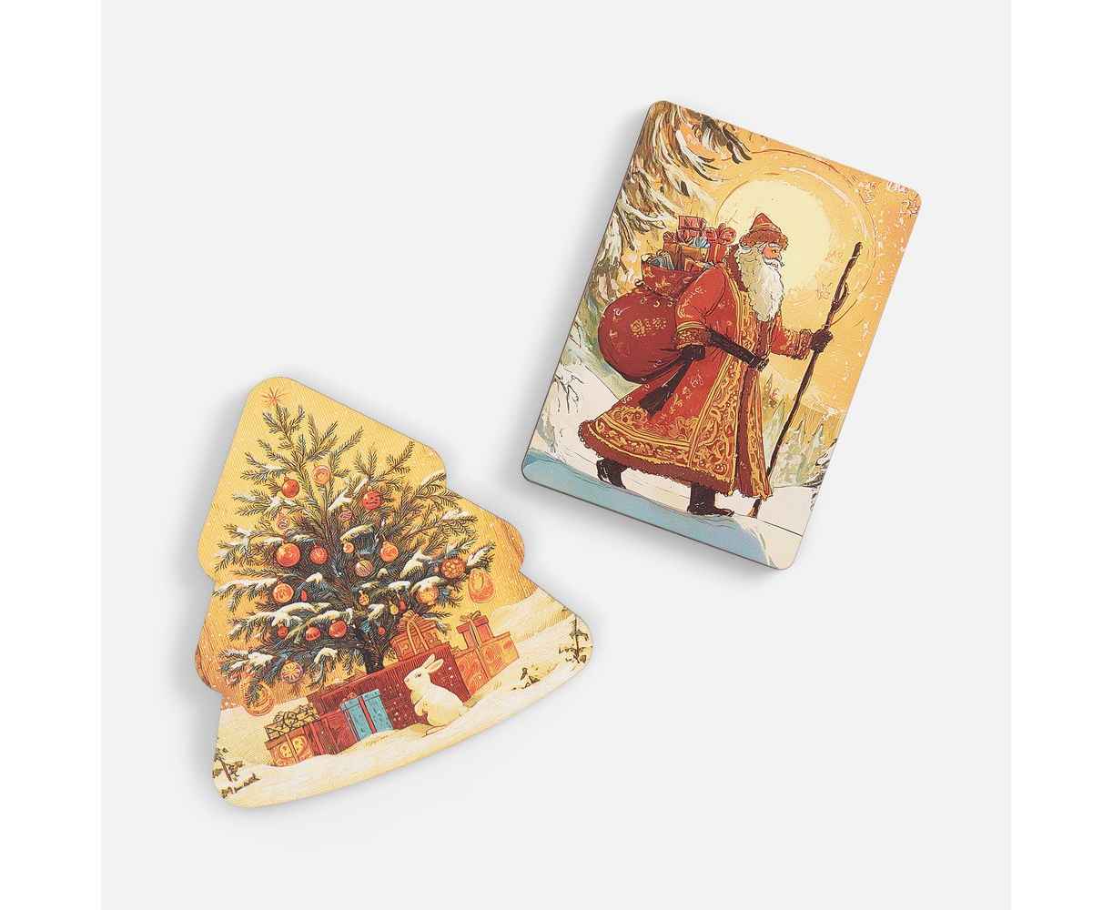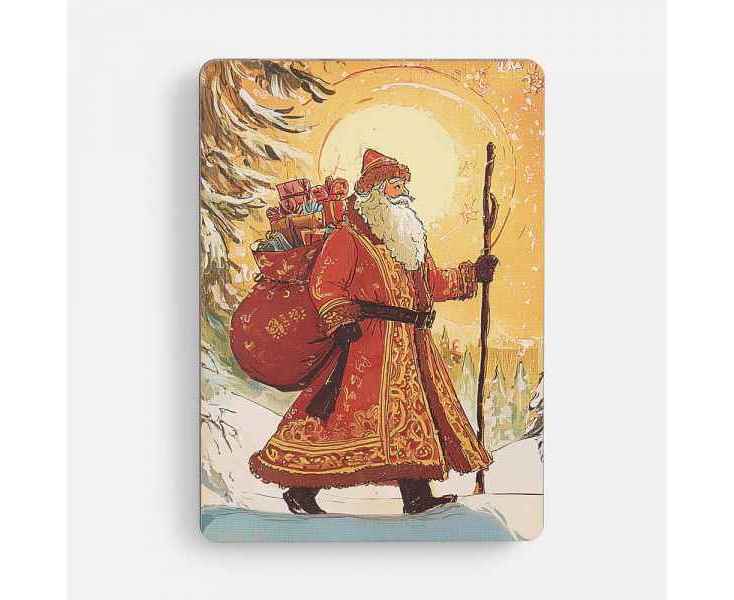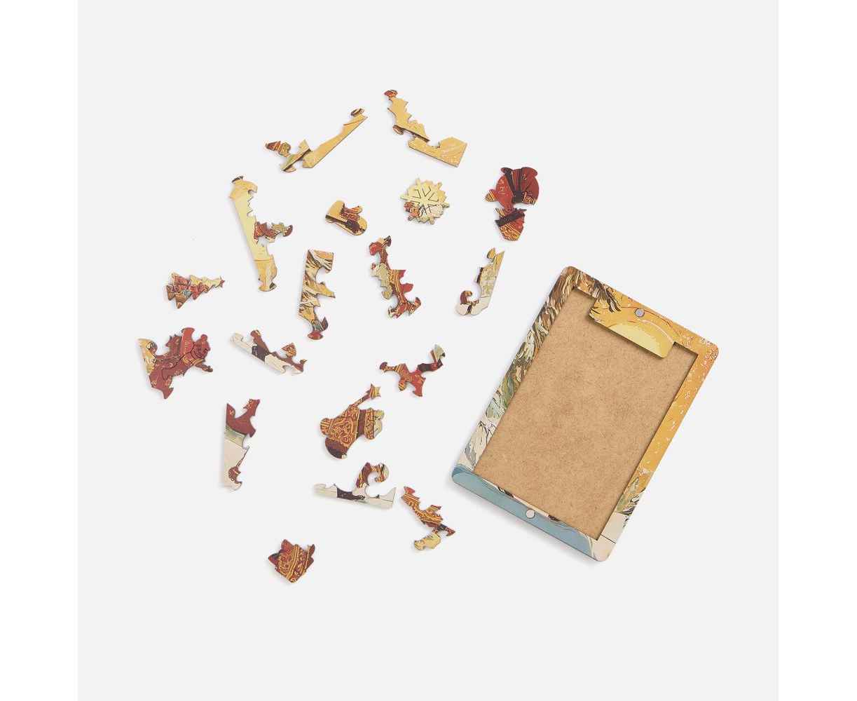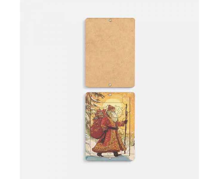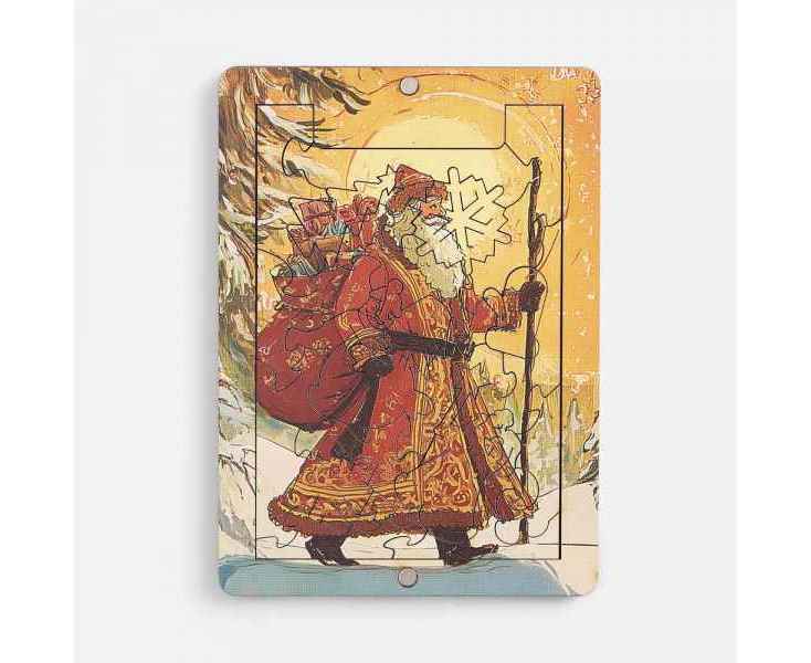 Пазлы изготовлены из дерева, а сама новогодняя картинка оформлена в открыточном ретростиле. В центре композиции — величественный Дед Мороз с богатым мешком подарков, символизирующий радость Нового года. Это не просто подарки, но и наступающий год, щедрый на все самое хорошее: радость, достаток и впечатления.