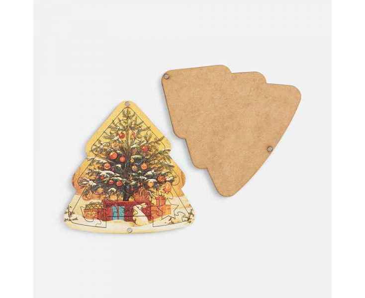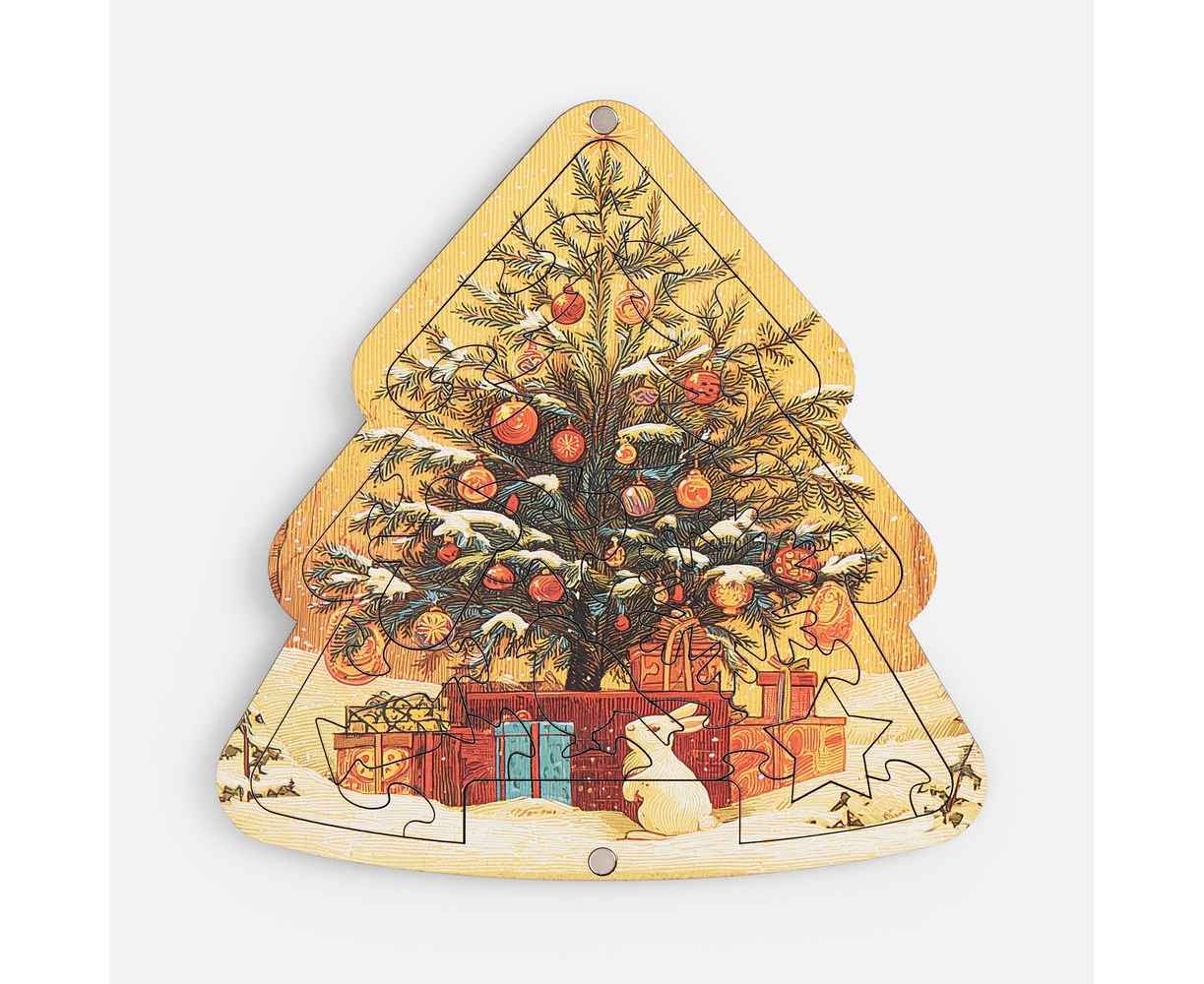 Очаровательный пазл в форме елочки — воплощение новогоднего уюта и тепла. Идеально украшенная елка в окружении подарков на фоне заснеженного пейзажа — просто сама гармония праздника. Такой стиль классической новогодней открытки подарит особое настроение и предвкушение волшебства!