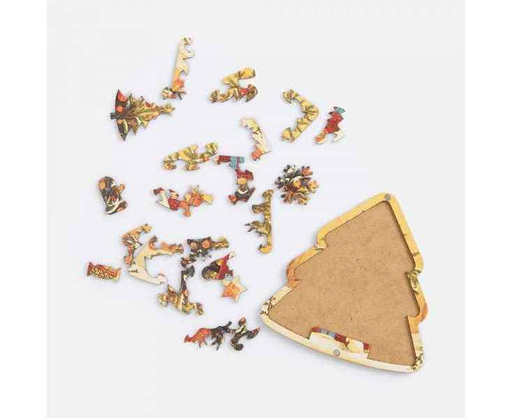 Деревянные элементы пазла разработаны с особой тщательностью: каждая деталь имеет уникальную форму, вдохновленную самим Новым годом, что делает процесс сборки особенно увлекательным и творческим.