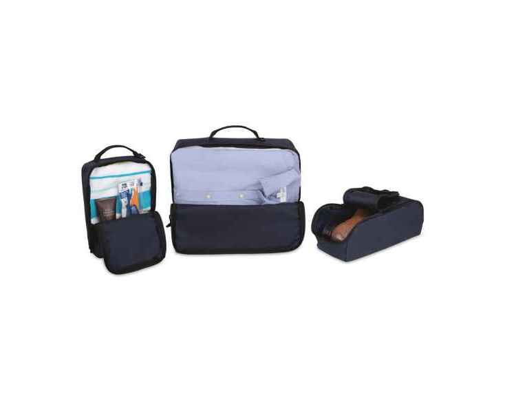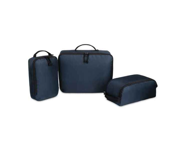 Современное и экологичное решение для упаковки вещей — органайзеры из переработанного материала, созданного из пластиковых бутылок. Набор из трех органайзеров поможет поддерживать порядок в путешествиях. Каждый органайзер оснащен верхней ручкой для удобства переноски. В сложенном виде органайзеры компактно помещаются друг в друга для хранения.