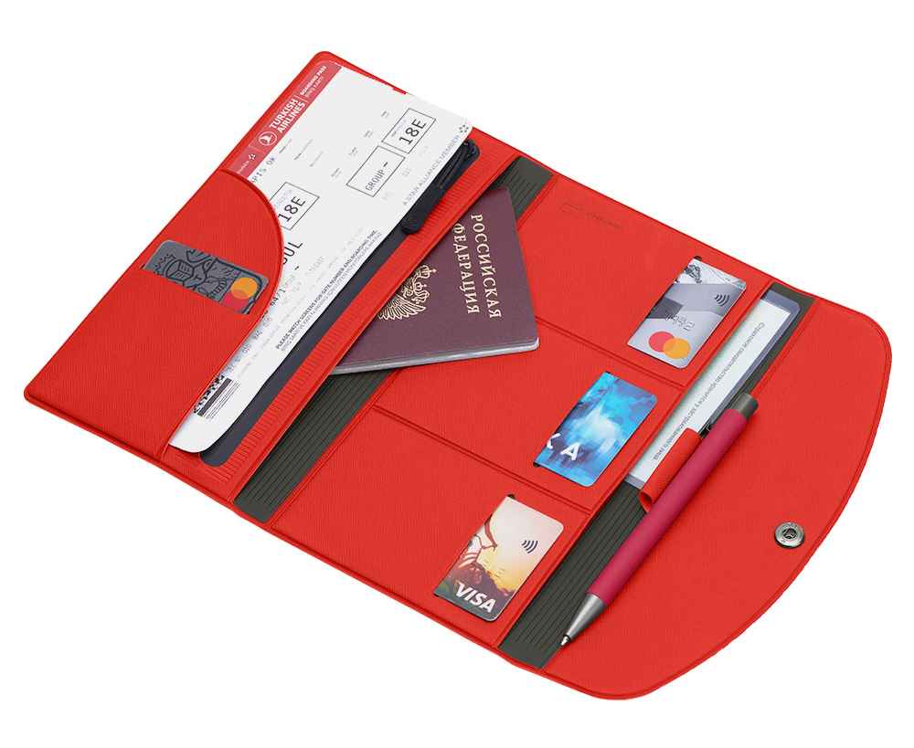 - Удобные отделения для паспорта, билетов, карт и страхового полиса.