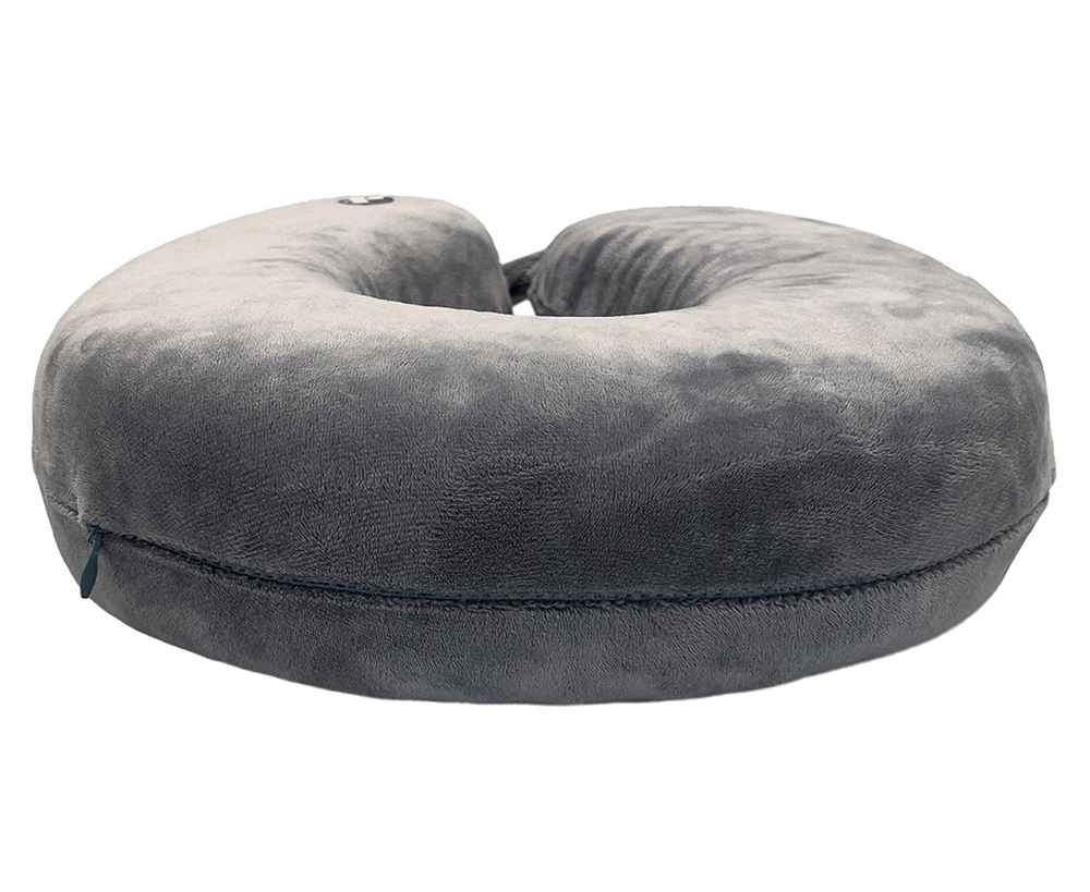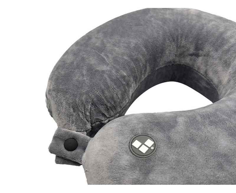 Удобная кнопочная застёжка надёжно фиксирует подушку на шее, а в комплект входит прочный круглый чехол на молнии — для компактного хранения и перевозки.