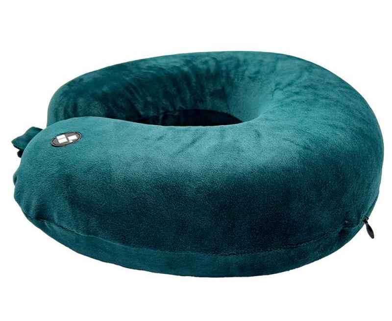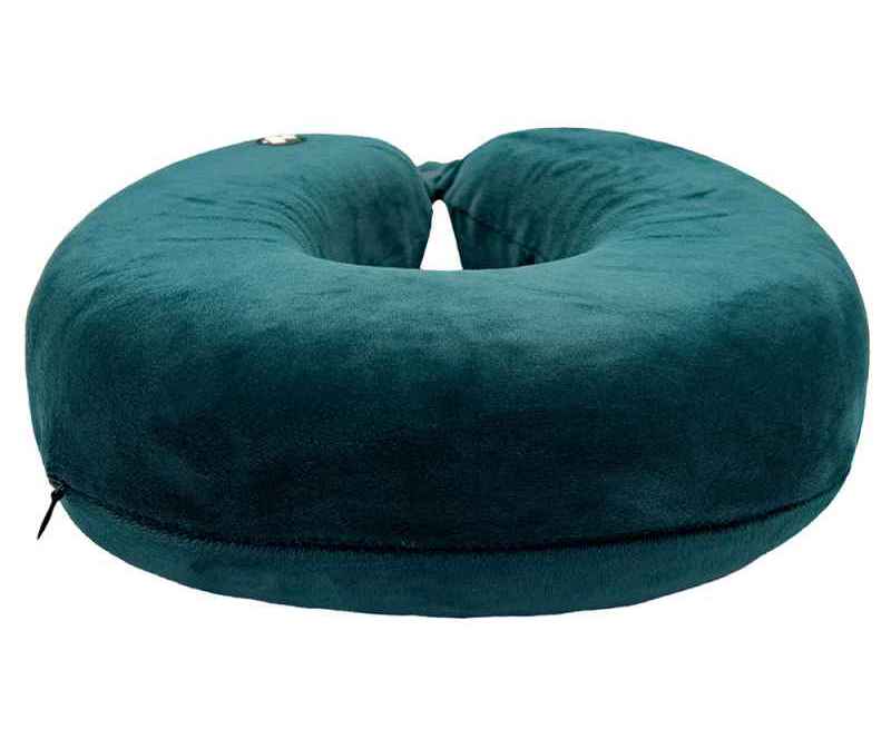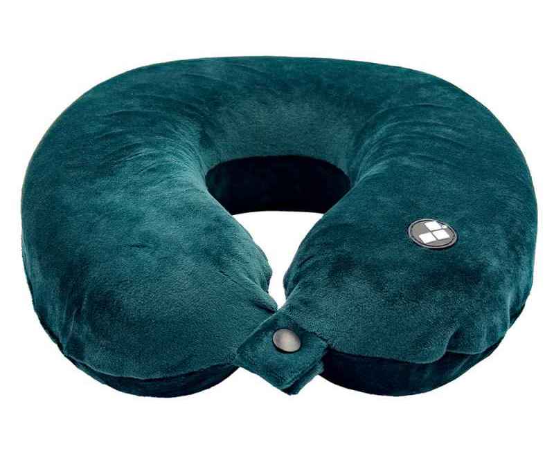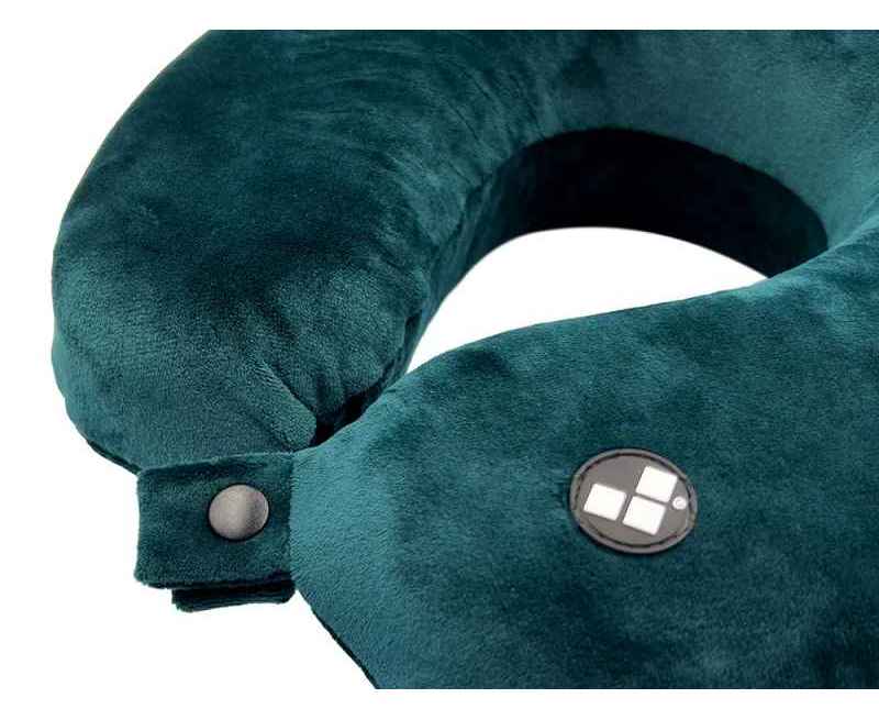 Удобная кнопочная застёжка надёжно фиксирует подушку на шее, а в комплект входит прочный круглый чехол на молнии — для компактного хранения и перевозки.