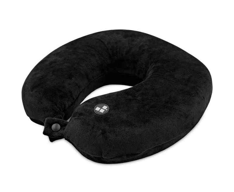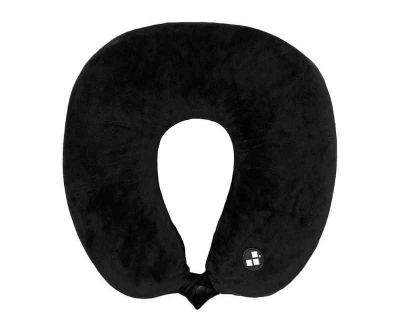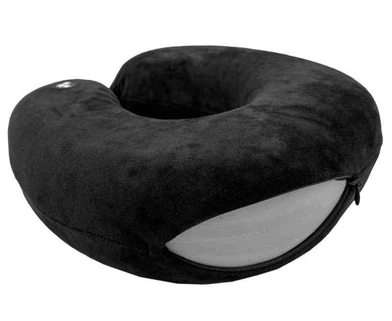Удобная кнопочная застёжка надёжно фиксирует подушку на шее, а в комплект входит прочный круглый чехол на молнии — для компактного хранения и перевозки.