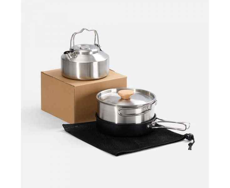 Продуманный дизайн набора позволяет сохранять место в походном рюкзаке: посуда со складными ручками компактно упаковывается в сетчатый чехол, который также входит в комплект.