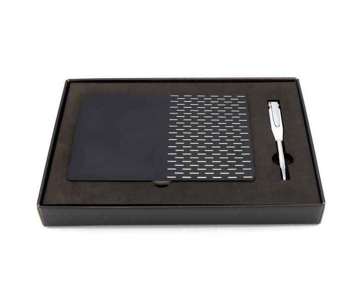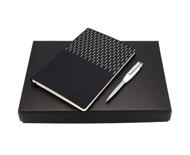 Подарочный набор в стильной цветной картонной коробке черного цвета (крышкой-дно). Внутри на аккуратном ложементе располагаются ежедневник А5 и элегантная металлическая ручка - флешка емкостью 64 ГБ.