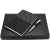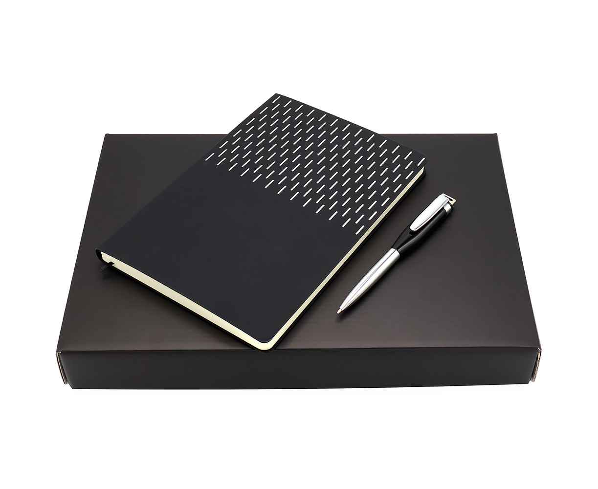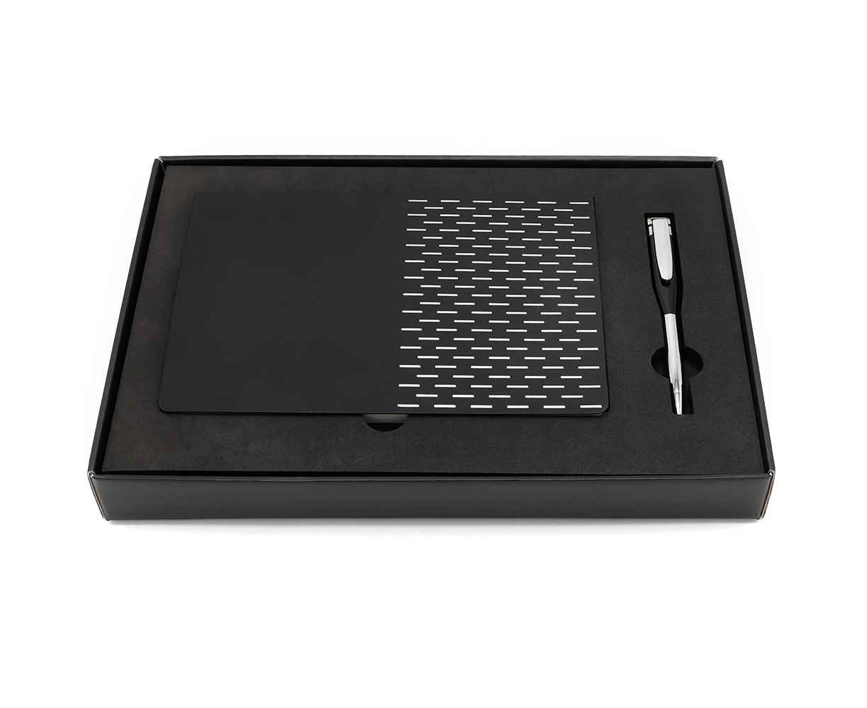 Подарочный набор в стильной цветной картонной коробке черного цвета (крышкой-дно). Внутри на аккуратном ложементе располагаются ежедневник А5 и элегантная металлическая ручка - флешка емкостью 64 ГБ.