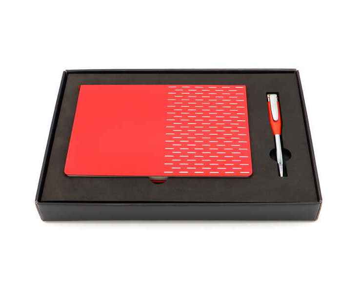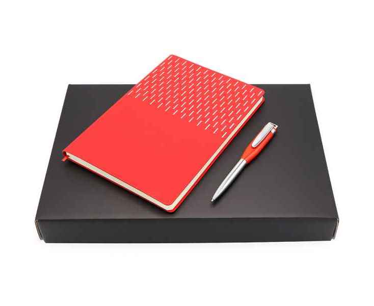 Подарочный набор в стильной цветной картонной коробке черного цвета (крышкой-дно). Внутри на аккуратном ложементе располагаются ежедневник А5 и элегантная металлическая ручка - флешка емкостью 64 ГБ.