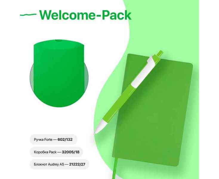 WELCOME-PACK – набор является отличным рабочим инструментом, который поможет сотрудникам, работающим дома, чувствовать свою связь с коллегами и руководством компании , В набор входят: , арт.,21222/27 Бизнес-блокнот AUDREY размер: 130х210 мм (формат А5) Мягкая термоактивная обложка PU Velvet Кремовая бумага (блок 70 гр, форзац 160 гр) Блок 128 страниц,,в линейку Перфорация 8 последних листов Ляссе в тон обложке Практичные закругленные углы FSC сертификат, , арт. 602/132 Ручка шариковая FORTE Стержень X-20, синий, чернила Dokumental Толщина пишущего узла 1 мм Материал:,пластик , арт. 32005/18 Коробка подарочная PACK Размер:,23х16х4 см Материал: картон ВНИМАНИЕ! Набор поставляется в разобранном виде.