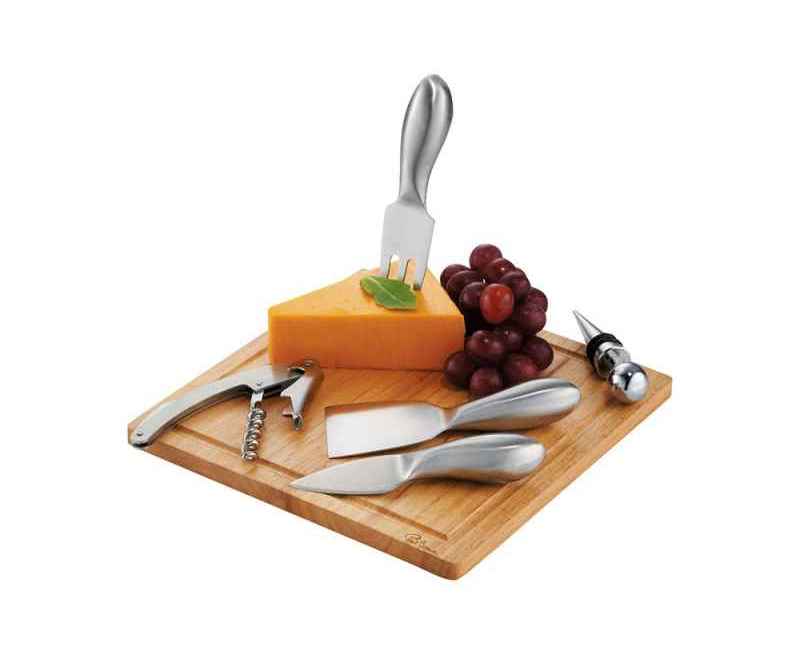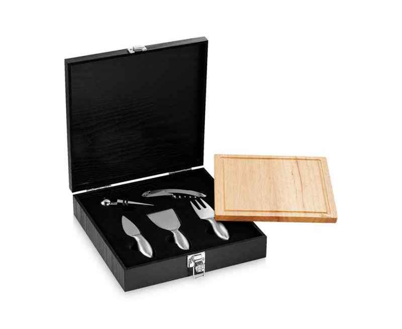 Набор для сыра и вина Mino. В этот набор из 6-ти предметов входит деревянная разделочная доска, три ножа для мягкого сыра, твердого и зрелого сыра, стоппер для вина и штопор. Набор предлагается в деревянной подарочной коробке с шильдом 40 х 25 мм для лого.