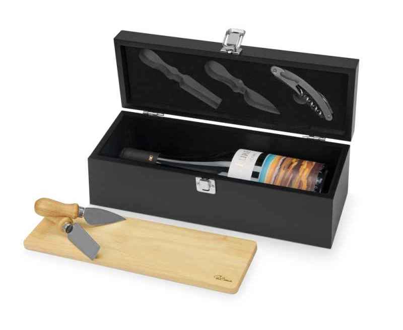 Набор Mino для вина и сыра. Коробка для вина со штопором и деревянная доска с двумя ножами для сыра. Вино и сыр не входят в набор. Набор упакован в деревянную коробку. Дерево и нержавеющая сталь.