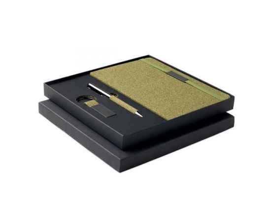Подарочный набор состоящий из блокнота формата А5 в твердом переплете на 160 линованных страниц из переработанной бумаги (80 листов/70 г/м²), шариковой ручки с металлическим наконечником и брелока. Материал: 20% чайного порошка, 30% пробки, 50% поликоттоновой ткани. Металлический шильд на эластичном ремешке.