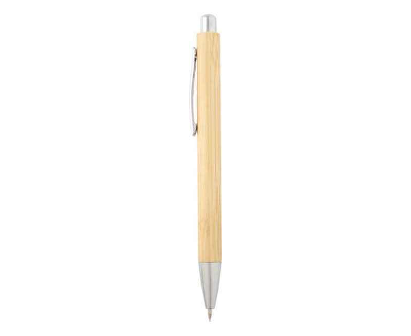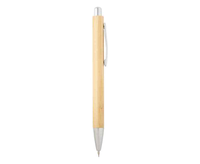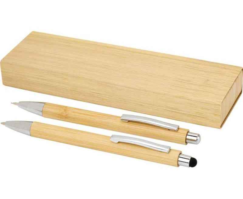 Набор Oblys состоит из шариковой ручки и механического карандаша, корпуса которых изготовлены из бамбука. Шариковая ручка имеет черный стилус и хромированный металлический зажим. Цвет чернил: черный. Размер пера: 1,00 мм. Длина непрерывной линии: 600 метров. Механический карандаш также имеет хромированный металлический зажим. Размер пера: 0,5 мм.