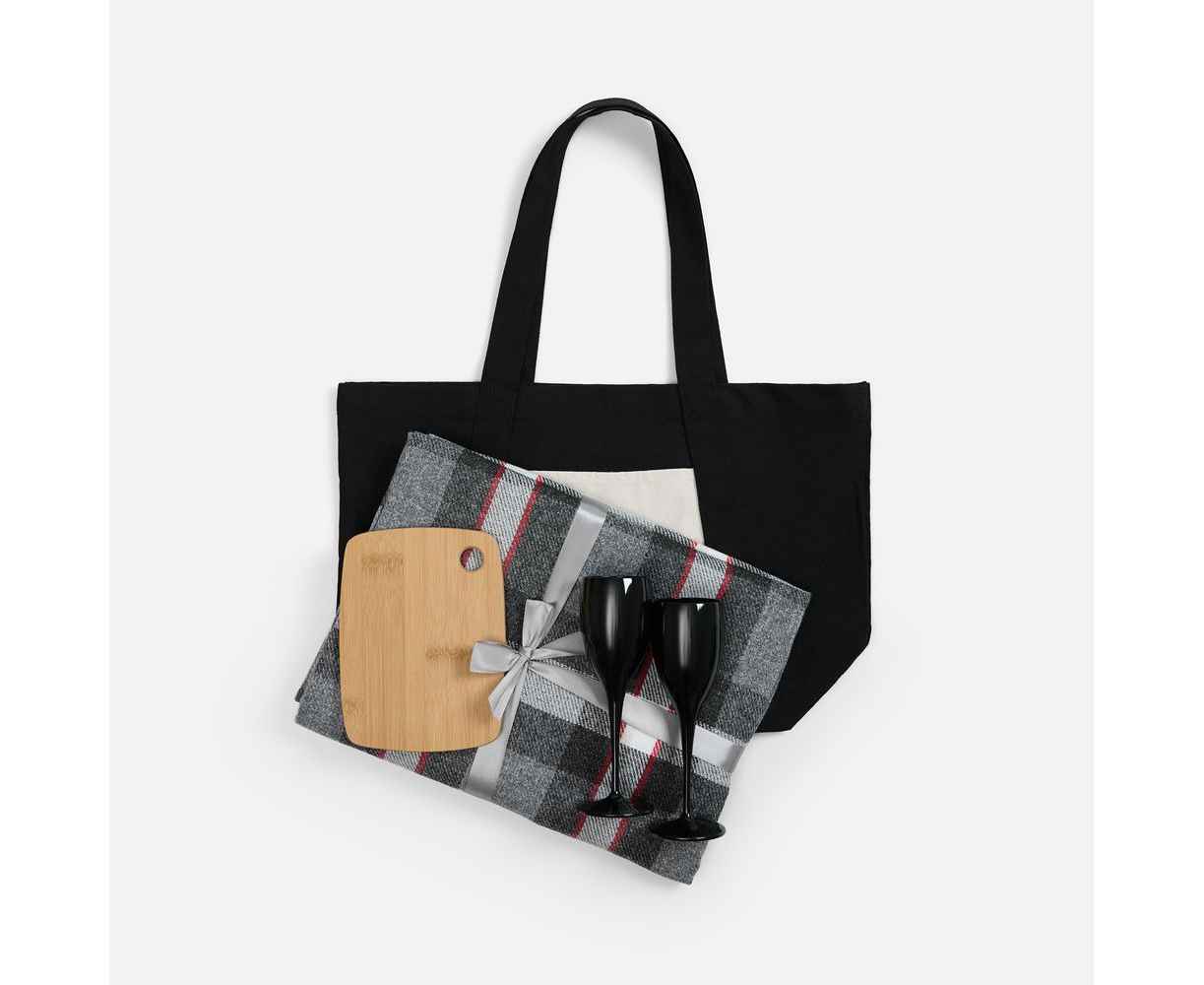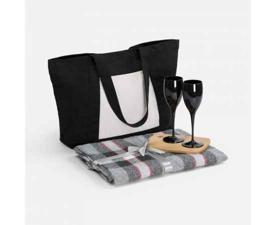 Этот стильный и лаконичный набор для пикника собрал все необходимое для комфортной и уютной вылазки на природу — теплый яркий плед, 2 бокала для шампанского и миниатюрную доску для нарезки и подачи любимых закусок. Все это легко помещается в стильный шопер.