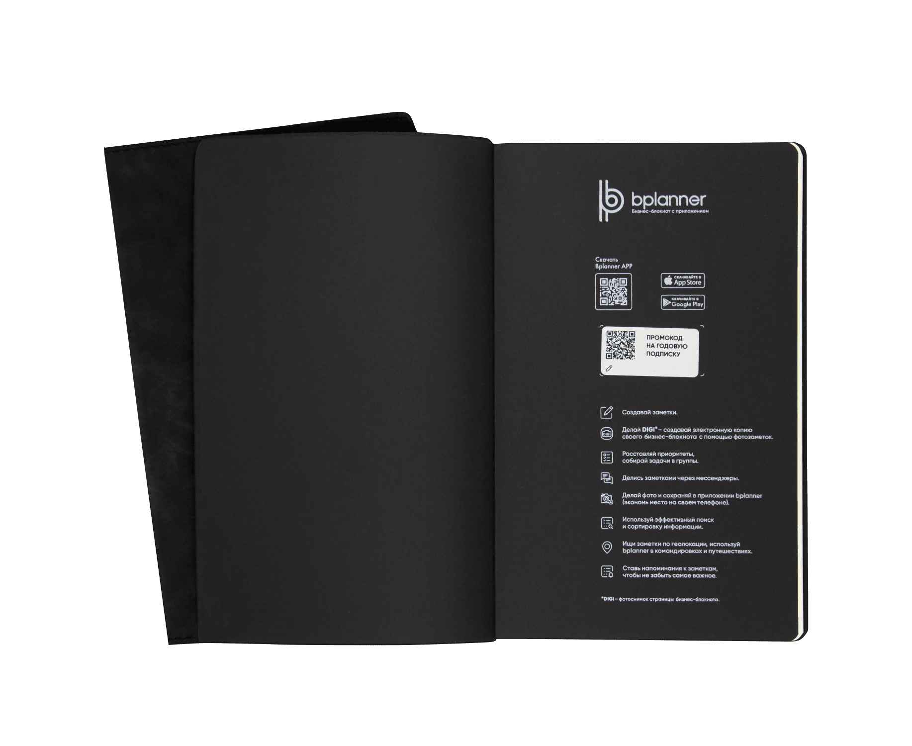 Бизнес-блокнот Bplanner. 05 — абсолютно новая модель в линейке Bplanner. Это бизнес-блокнот с недатированным тонированным блоком в клетку. Блок имеет ряд особенностей: наличие титульного листа с возможностью добавления личных данных и контактной информации, трекер воды и шагов на каждой странице и 3 разворота для заметок в конце блокнота. Обложка изготовлена из экокожи Nubuk-touch и имеет прострочку по краю в цвет материала. Фактура материала напоминает замшу или нубук. У блокнотов цветной форзац и нахзац. На форзаце расположен qr-код, который активирует годовой доступ к мобильному приложению. А приложение способно теперь еще и распознать и оцифровать текстовые заметки.