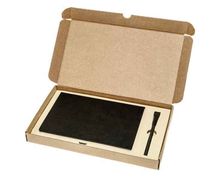 Подарочный набор в стильной картонной коробке бежевого цвета. Внутри на аккуратном ложементе располагаются ежедневник недатированный в твердом переплете и картонная ручка с колпачком.