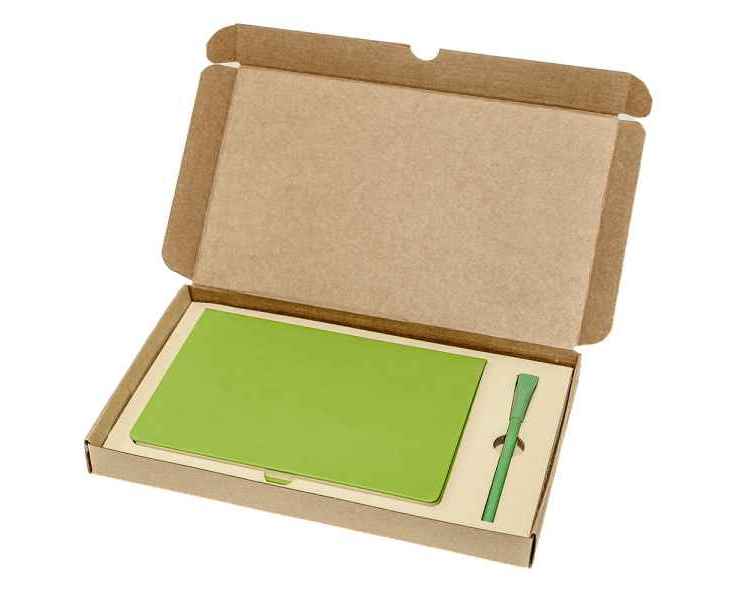 Подарочный набор в стильной картонной коробке бежевого цвета. Внутри на аккуратном ложементе располагаются ежедневник недатированный в твердом переплете и картонная ручка с колпачком.