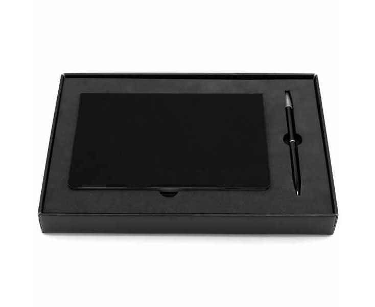 Подарочный набор в стильной цветной картонной коробке черного цвета (крышкой-дно). Внутри на аккуратном ложементе располагаются ежедневник А5 и вечный карандаш с шариковой ручкой.