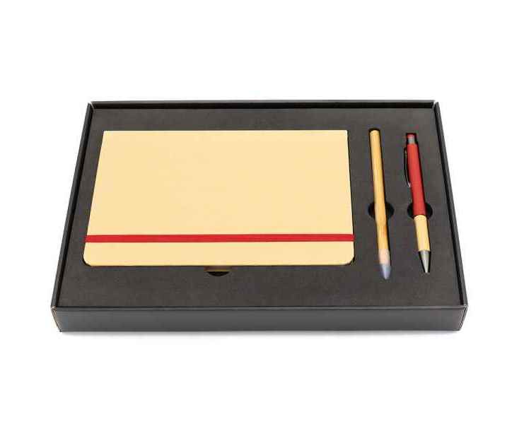 Подарочный набор в стильной цветной картонной коробке черного цвета (крышкой-дно). Внутри на аккуратном ложементе располагаются блокнот, ручка c корпусом из бамбука, и вечный карандаш.