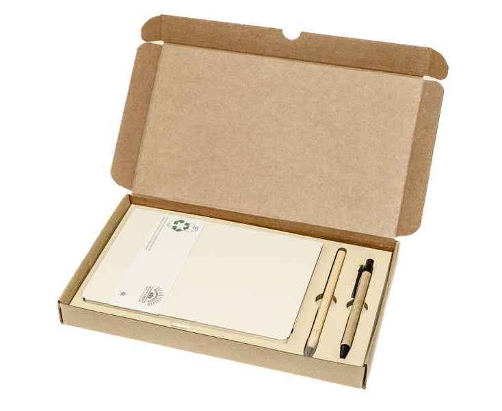 Подарочный набор в стильной картонной коробке бежевого цвета. Внутри на аккуратном ложементе располагаются ежедневник недатированный в твердом переплете и картонная ручка с колпачком.