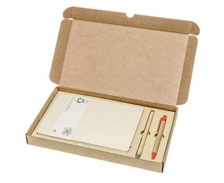 Подарочный набор в стильной картонной коробке бежевого цвета. Внутри на аккуратном ложементе располагаются ежедневник недатированный в твердом переплете и картонная ручка с колпачком.