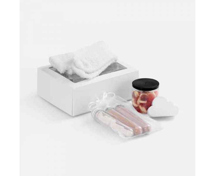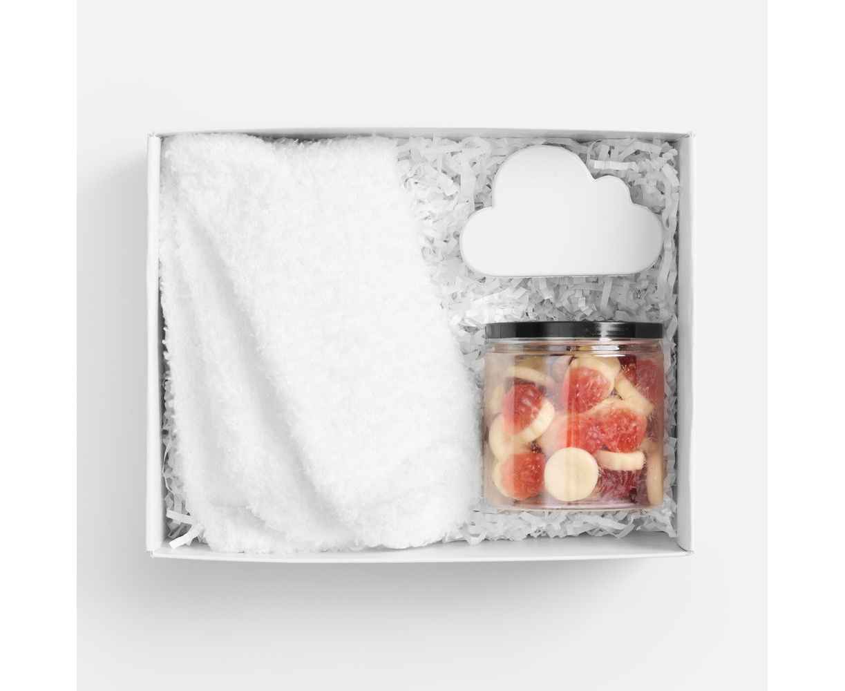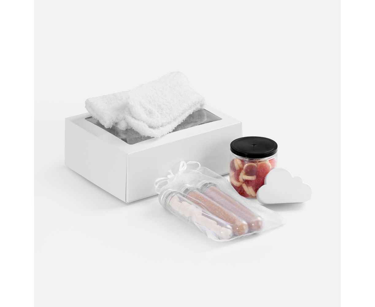 Белый-белый набор с мягкими пушистыми носками, нежным жевательным мармеладом со сливочно-ягодными нотками и антистрессом‑облаком подарит хорошее настроение, поможет замедлиться и снять стресс.