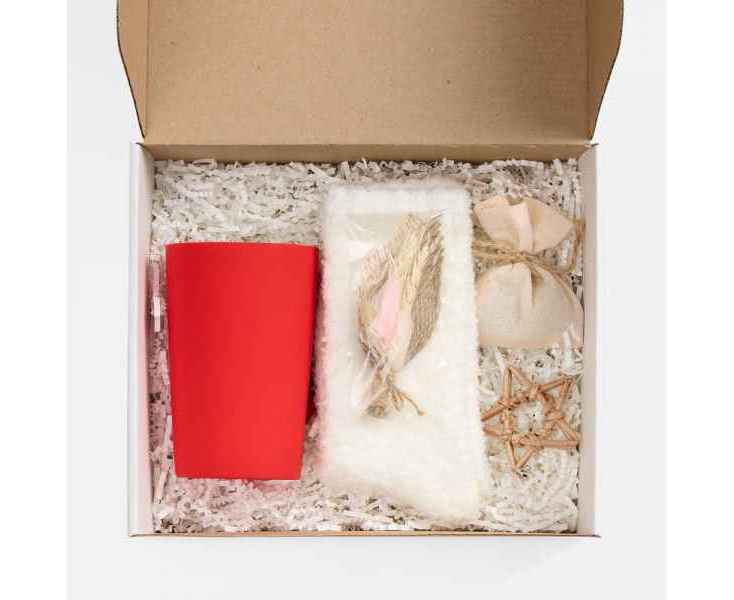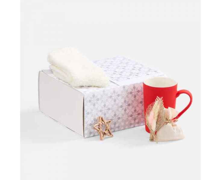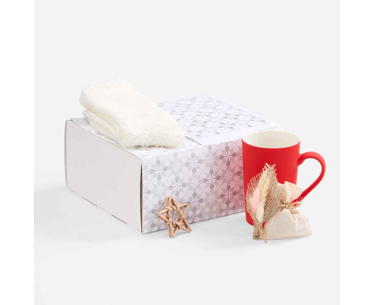 В изящной коробке — лаконичный дуэт, созданный исключительно для комфорта и спокойных мгновений: софт-тач кружка для любимых напитков и мягкие пушистые носки для полного расслабления.