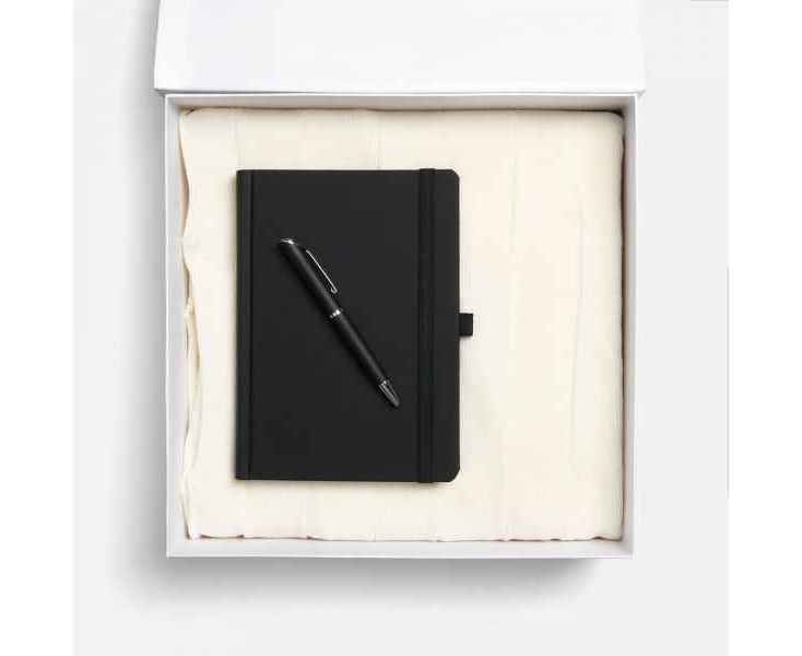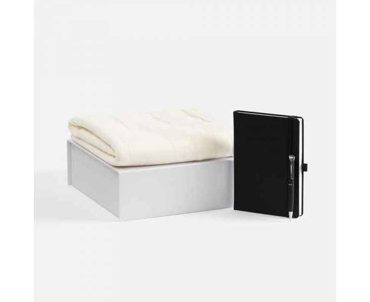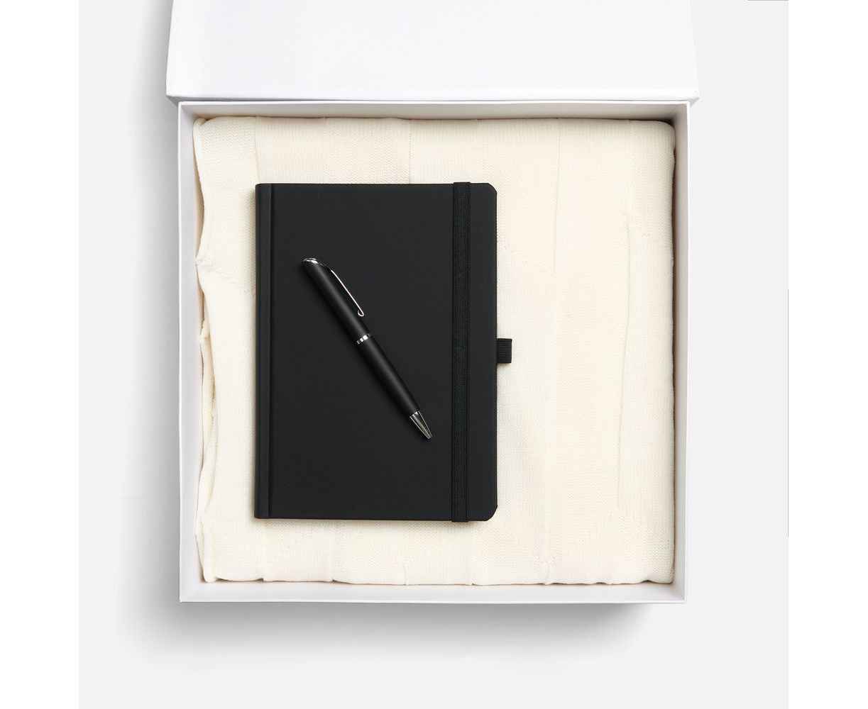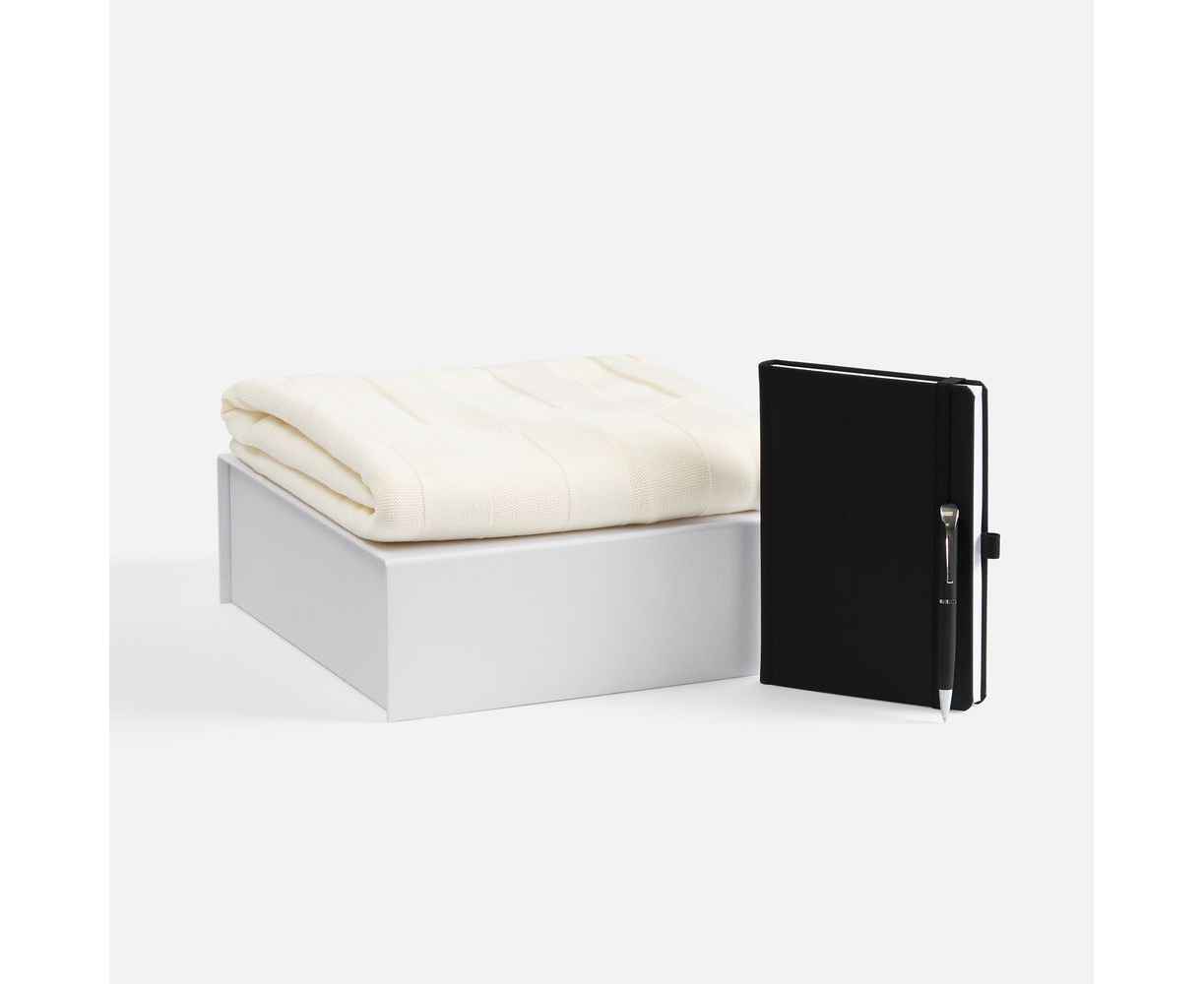 Однотонный набор с основной канцелярией и пледом — классика жанра в уютном исполнении. С компактным ежедневником будет удобно делать заметки в любое время — благодаря петельке для ручки любимый пишущий инструмент будет всегда под рукой. А изысканный акриловый плед с геометрическим узором позволит выразить самые теплые пожелания и ддобавит плавных линий в интерьер.
