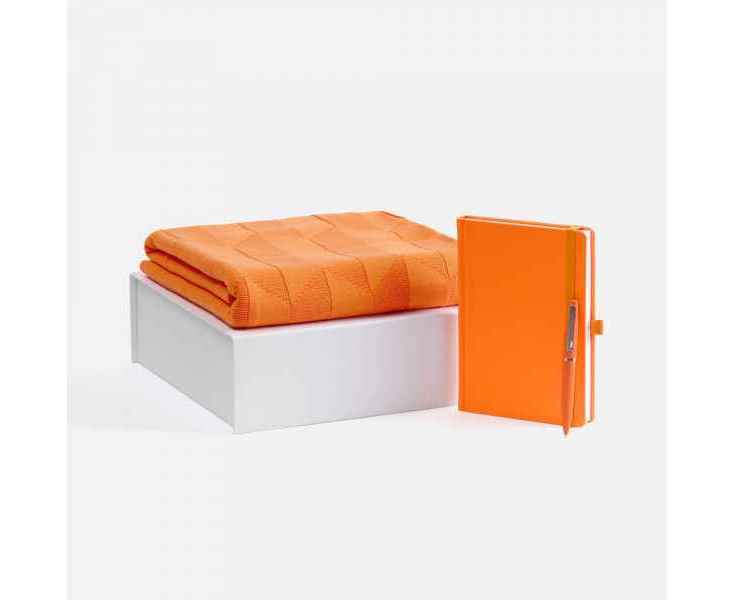 Однотонный набор с основной канцелярией и пледом — классика жанра в уютном исполнении. С компактным ежедневником будет удобно делать заметки в любое время — благодаря петельке для ручки любимый пишущий инструмент будет всегда под рукой. А изысканный акриловый плед с геометрическим узором позволит выразить самые теплые пожелания и ддобавит плавных линий в интерьер.