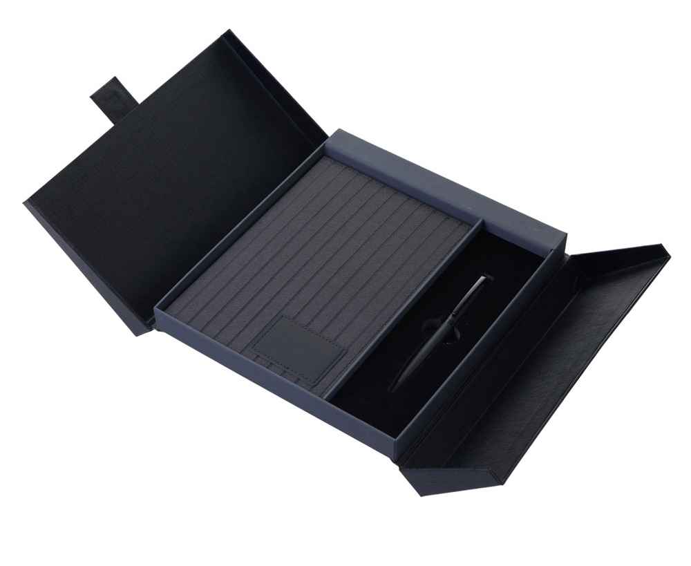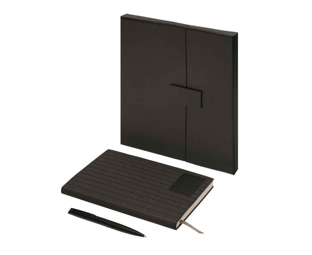 Bradbury & Co - это элегантный подарочный набор, упакованный в красивую коробку на магните. Внутри — блокнот в обложке из рифленой экокожи и металлическая шариковая ручка. Ручка гармонирует с блокнотом за счет рифленой нижней части, а блокнот имеет специальный патч для нанесения логотипа (который можно также нанести на более ровную поверхность на обороте блокнота) и ляссе-закладку для удобства. При гравировке на ручке вскрывается эффектный серебристый цвет.