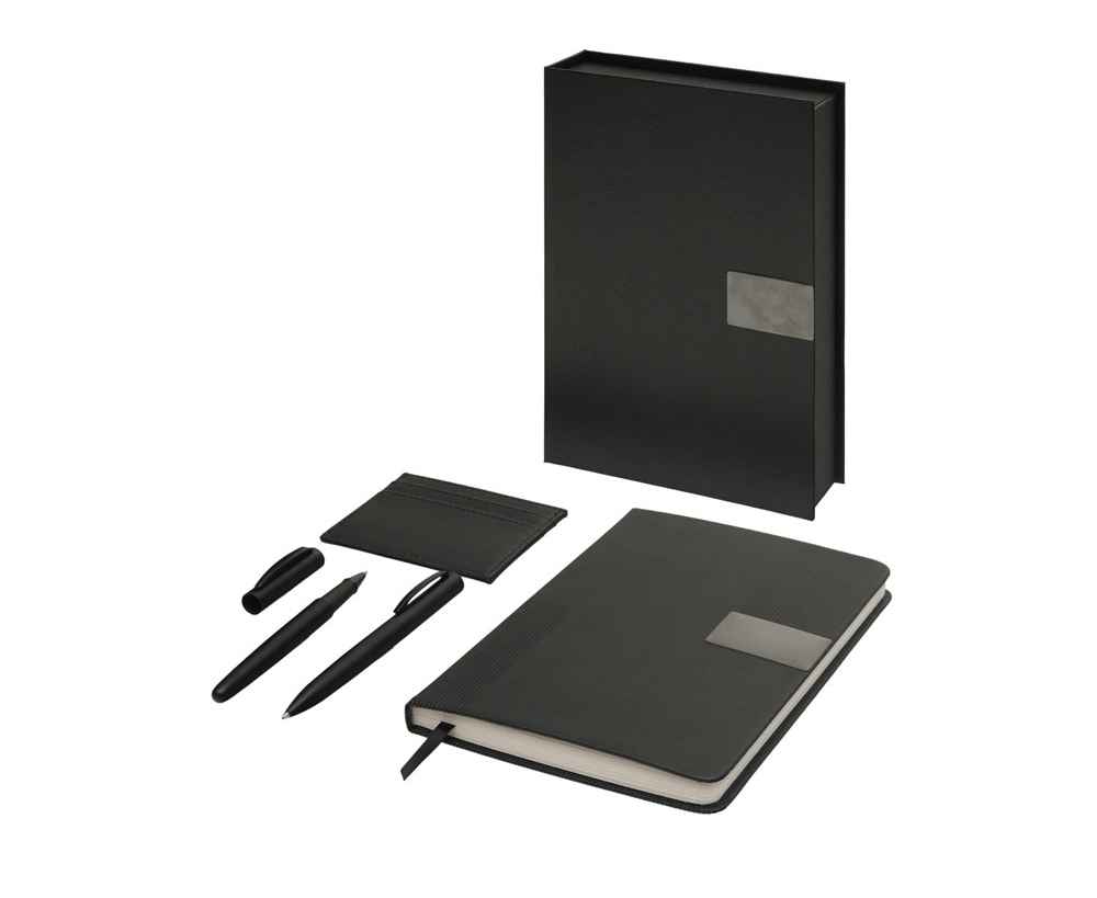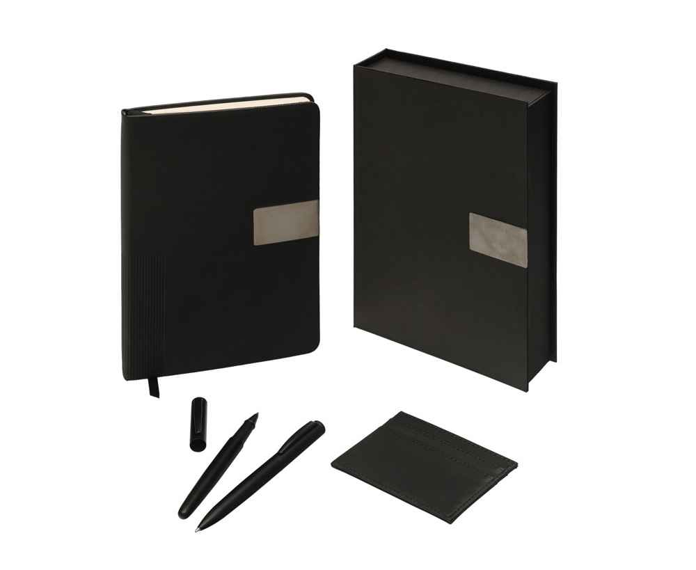 Goethe - это премиальный подарочный набор в коробке, закрывающейся на магнит. Комплект включает две ручки — шариковую и роллер — с высококачественными синими немецкими чернилами Dokumental и пишущими узлами Premec (в шариковой). Их дополняет картхолдер из экокожи на 4 карты с отделением для наличности. Завершает этот комплект блокнот в твердой обложке из искусственной кожи. Внутри него 96 листов кремовой бумаги с FSC-сертификатом плотностью 80 г/м2.
