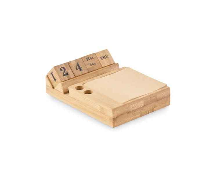 Bamboo desktop calendar with phone holder functionality, 2 pen holders and 50 sticky note sheets. FSC®-certified | FSC 100%, N5.7, FSC-C213206.