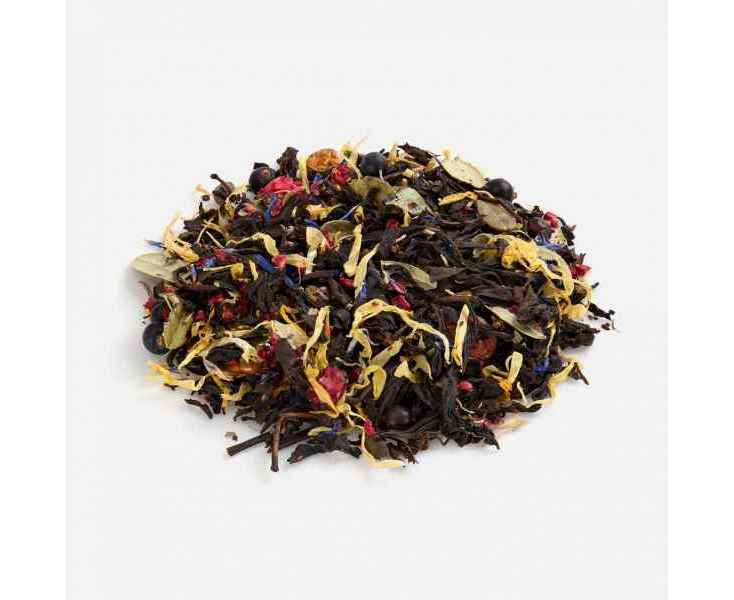 Состав: чай черный индийский листовой, ягоды брусники сублимированные, ягоды облепихи сублимированные, кусочки малины сублимированные, плоды можжевельника, мелисса, лепестки календулы, лепестки василька, листья брусники, боярышник, аромат лесных ягод