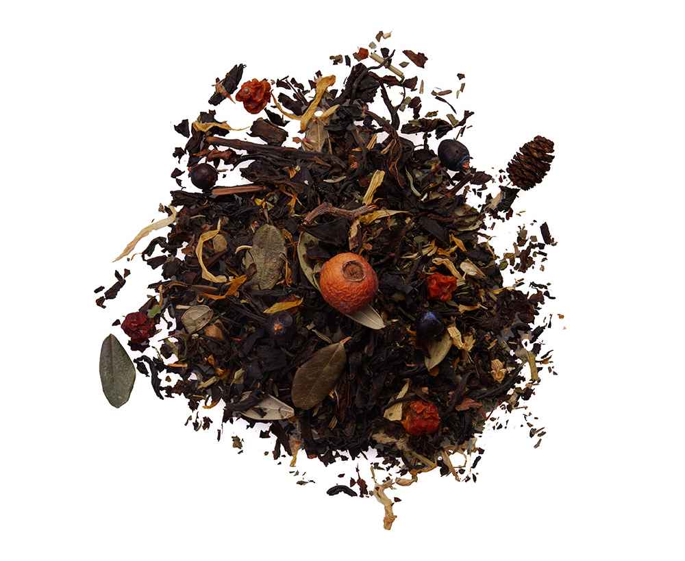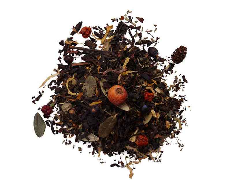 Состав: купаж крупнолистового черного индийского чая, рябина красная сушеная, календула, шишки ольхи, хвоя сосны, мята, можжевельник, чабрец, ежевика лист, брусника лист целый, боярышник