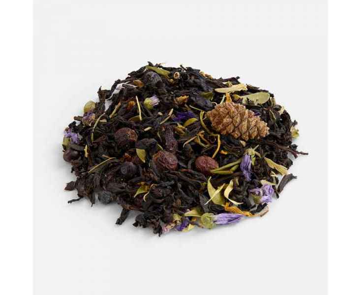 За ягодный вкус отвечают сублимированные малина и смородина, усиленные ароматом черной смородины. Лепестки календулы и мальвы придают настою солнечный оттенок и цветочное послевкусие. Идеальный баланс между тонизирующим эффектом и ягодной сладостью.Состав: чай черный, плоды боярышника, клюква, листья брусники, плоды можжевельника, мята, сосновые шишки, розмарин, листья саган-дайля, лепестки календулы, малина, сублимированная, красная смородина сублимированная, цветки мальвы, ароматизатор «Черная смородина».