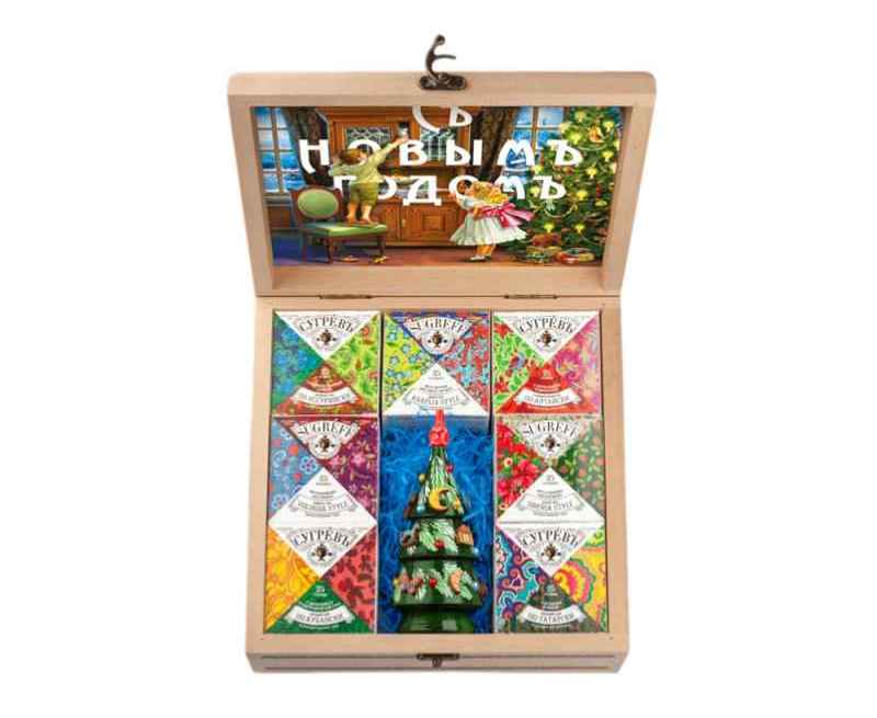 Подарочный набор из семи эксклюзивных купажей листового чая, характерных для разных регионов России и елки ручной работы с натуральным вареньем, в сувенирной шкатулке из массива берёзы.