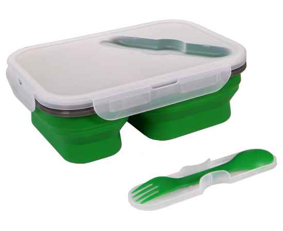 Герметичный выдвижной ящик из силикона и полипропилена с двумя отделениями емкостью до 480 мл и 760 мл. Вверху крышки находится штуцер со столовыми приборами (в комплекте) с функцией 2 в 1, вилкой и ложкой. Коробка подходит для микроволновой печи, крышка должна быть снята. 212 x 153 x 73 мм | Изгиб: 212 x 153 x 38 мм